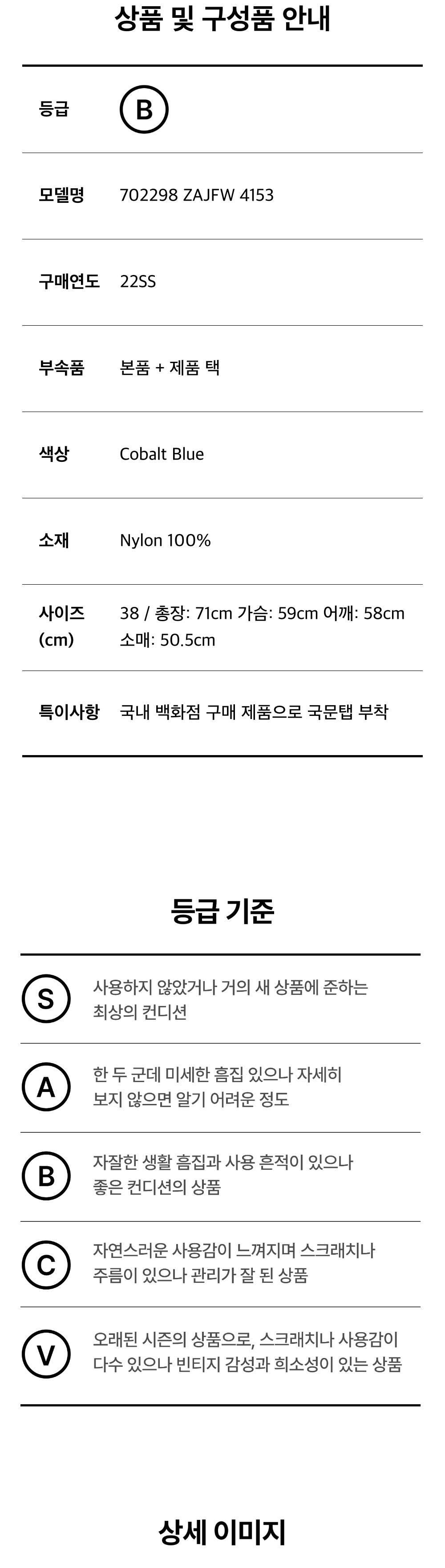 모든 상품(가죽, 의류, 잡화, 슈즈 등)은 사용자의 사용방법과 환경에 따라 변형, 변색이 될 수 있으니 반드시 취급 라벨에 표시된 관리 안내를 따르시길 권장 드립니다. 이는 정도의 차이가 있으며 과도한 체열과 땀, 습기, 빛, 마찰은 제품의 손상 및 변형을 일으킬 수 있으므로 주의하시길 바랍니다.