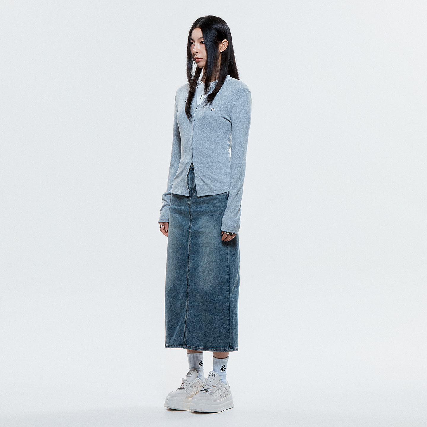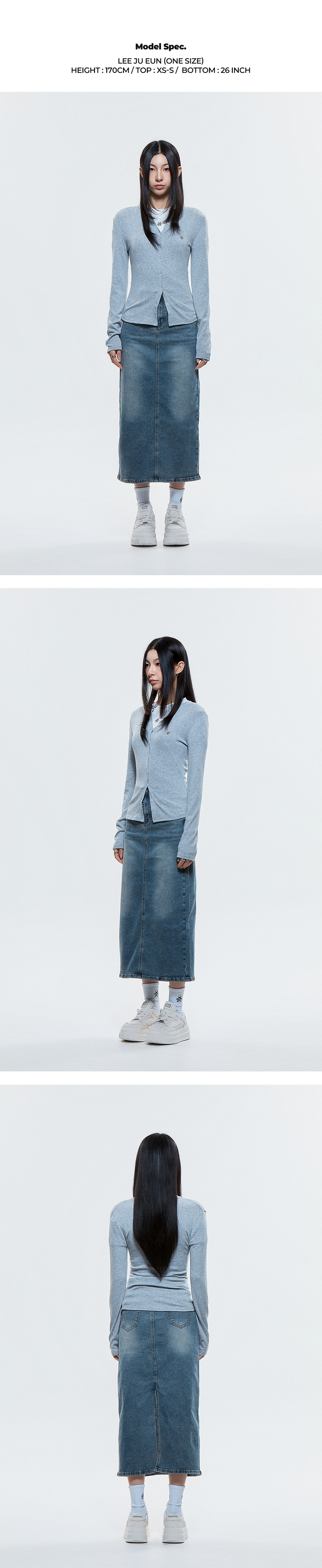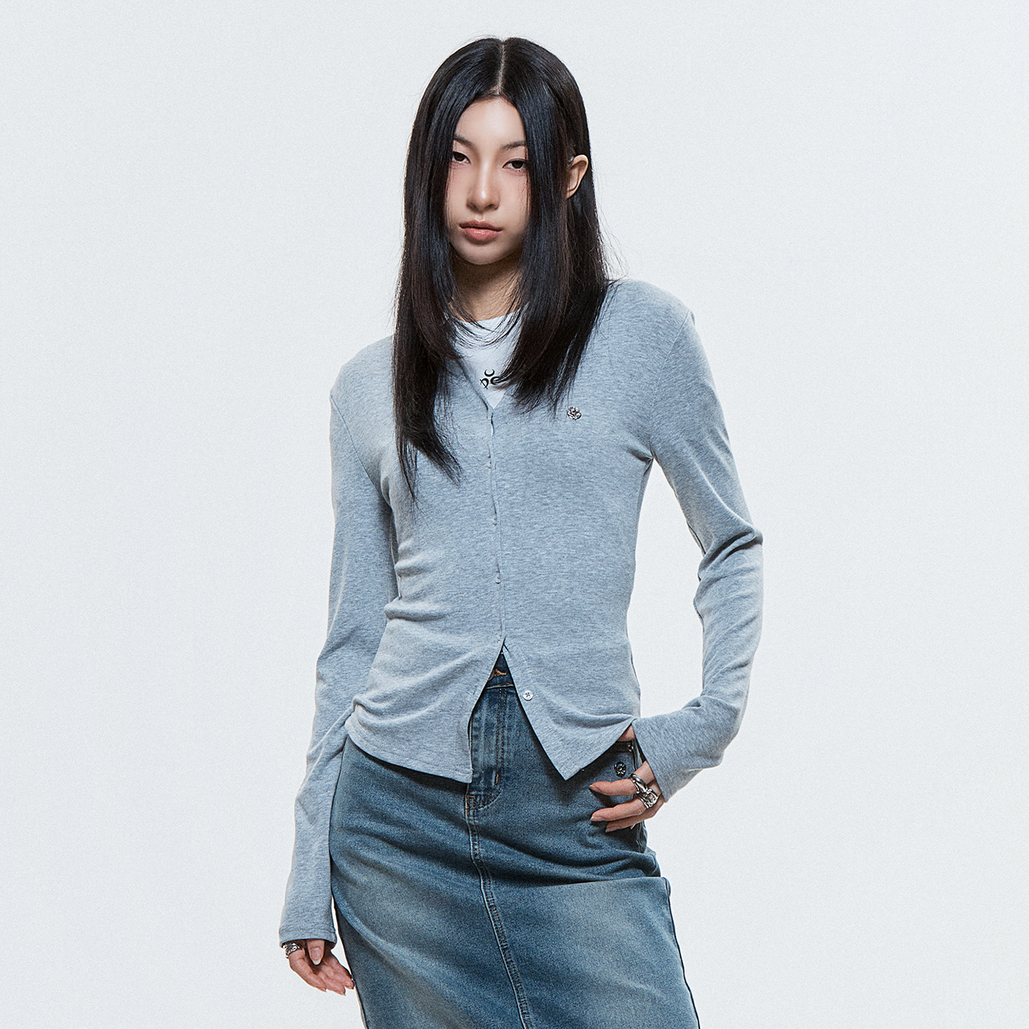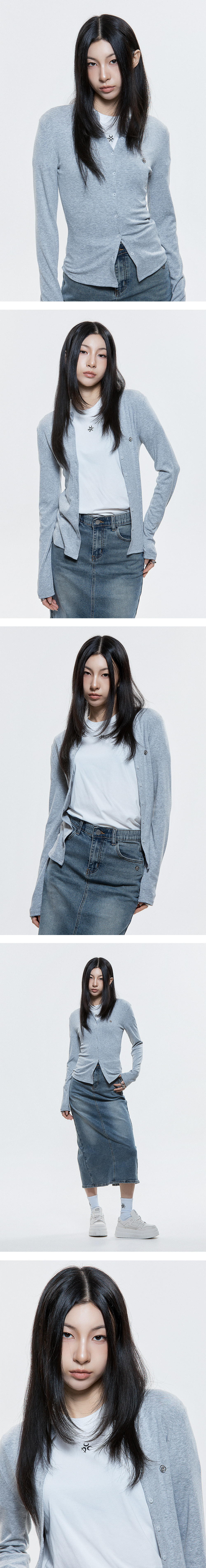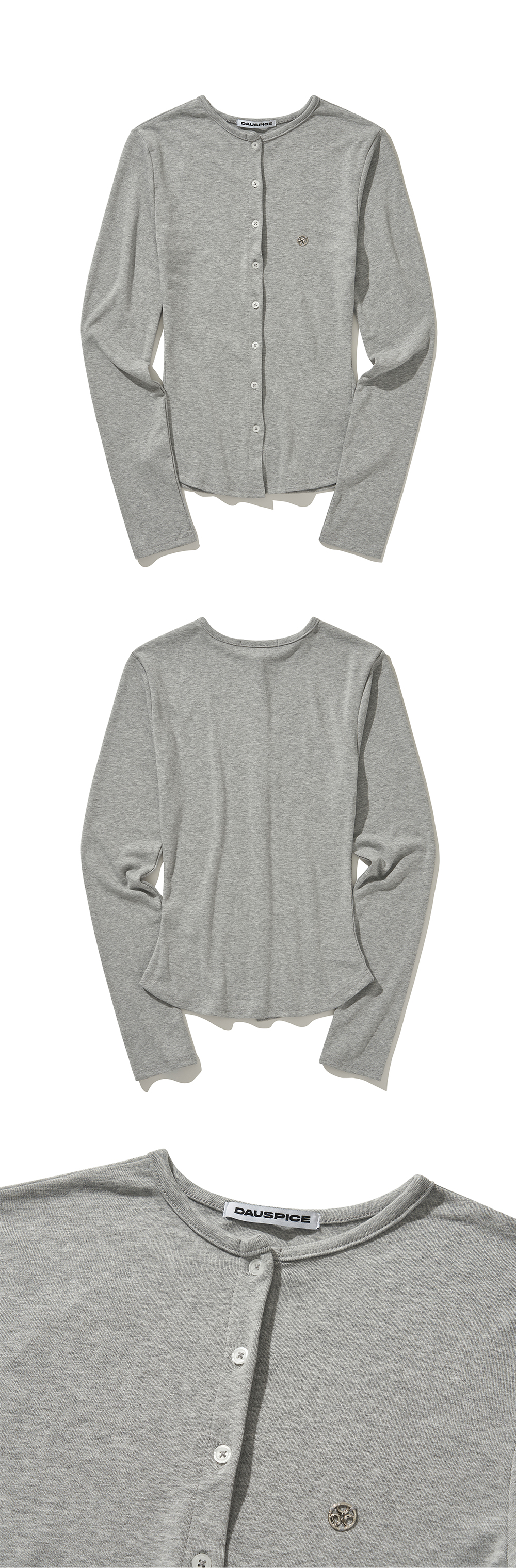 Product Description. ㆍ핏: 타이트핏 ㆍ단추를 활용해 라운드넥과 브이넥 두 가지 연출을 할 수 있습니다. ㆍ스판 혼방 립 원단으로 뛰어난 신축성과 착용감을 줍니다. ㆍDUC 심볼 앰블럼 포인트 ㆍ44–55까지 착용 가능한 프리 사이즈 Product Size & Info. Size : One Size Color : Black, Gray Material : Polyester 62%, Rayon 33%, Spandex 5% One Size : Length 54 / Shoulder 36 / Chest 34 / Hem 36 / Sleeve Length 63 Model Spec. 이주은 (One Size 착용) Height : 170cm / Top : XS-S / Bottom : 26 inch Washing Tip. Dry cleaning + Only hand washing 드라이 클리닝 또는 손세탁을 권장하며 케어 라벨을 참고해 주세요. MADE IN KOREA.