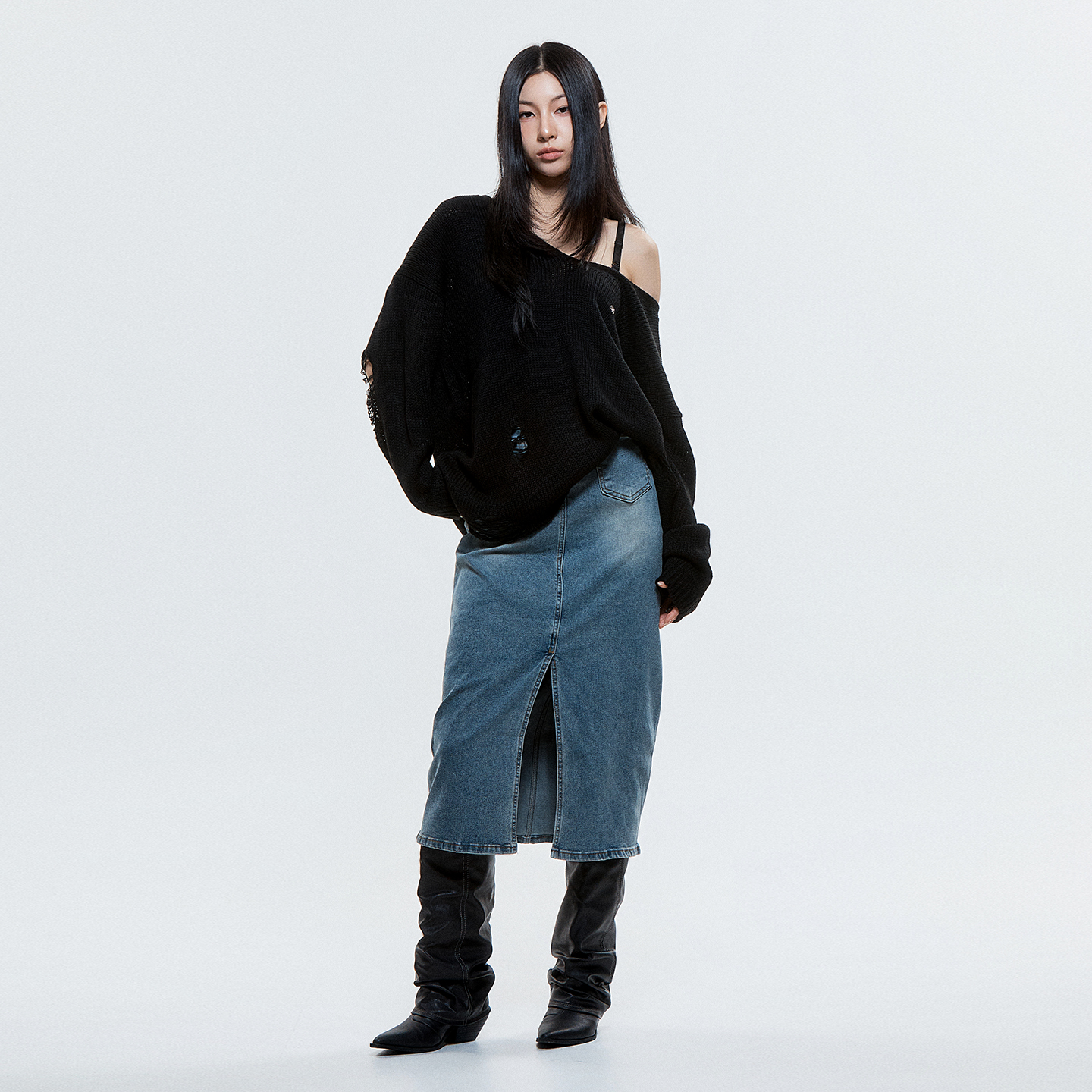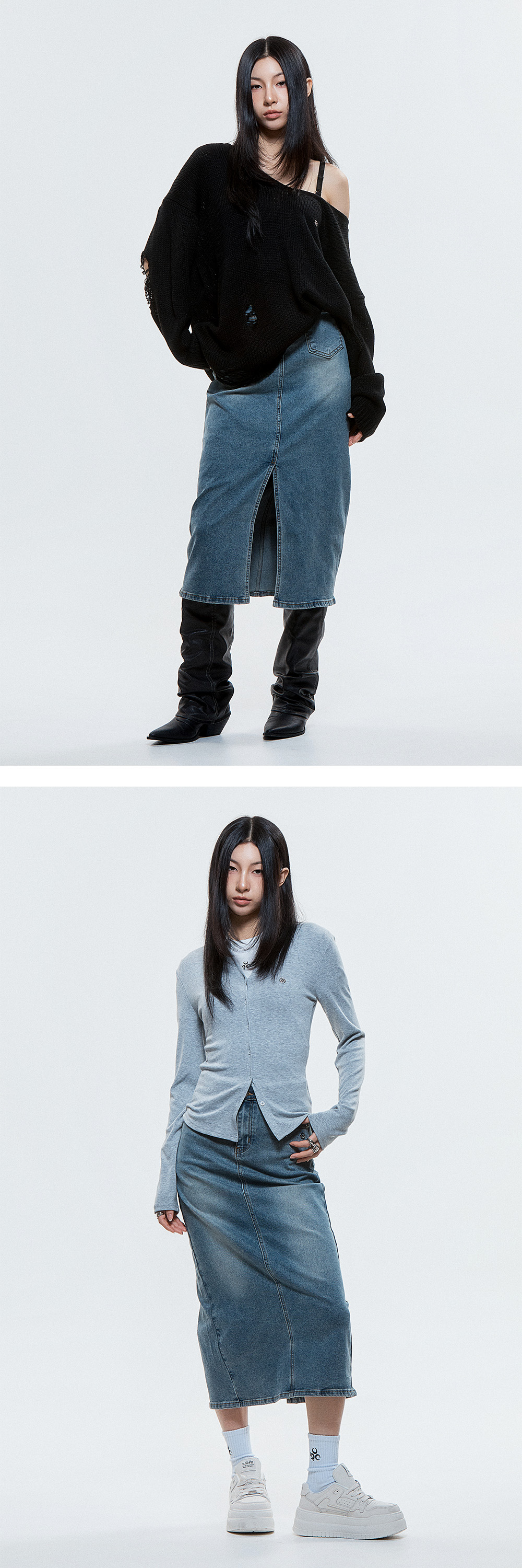 Product Description. ㆍ핏: H라인 ㆍH라인의 뒷트임이 포인트인 중청 컬러의 데님 스커트입니다. ㆍ은은하게 들어간 워싱과 틴 염색 ㆍ적당한 신축성의 트윌 직조 원단 ㆍDUC 심볼 앰블럼 포인트 ㆍ44–55까지 착용 가능한 프리 사이즈 Product Size & Info. Size : 1, 2 Color : Midnight Blue Material : Cotton 98%, Polyester 2% 1 Size : Length 84 / Waist 33 / Hip 40 (Waist 26-27 inch) 2 Size : Length 85 / Waist 35 / Hip 42 (Waist 27-28 inch) Model Spec. 이주은 (1 Size 착용) Height : 170cm / Top : XS-S / Bottom : 26 inch MADE IN KOREA.