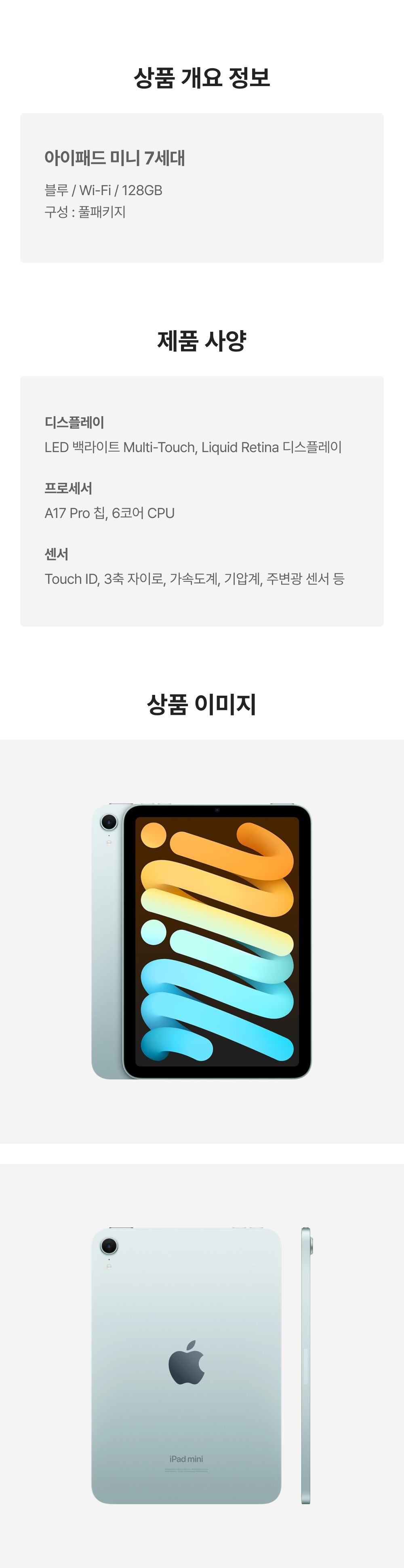 [S등급] 리퍼비시 아이패드 미니 7세대 wifi A17 Pro 128기가 블루