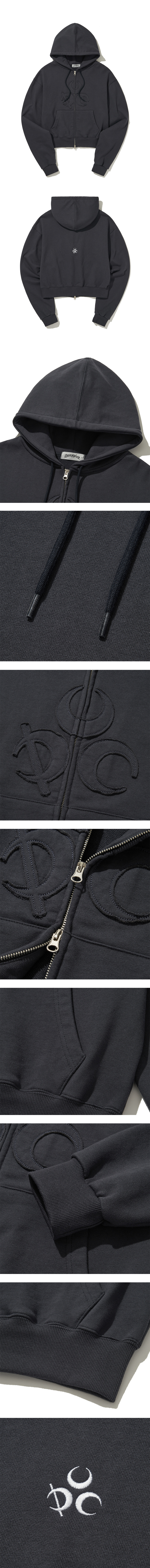 Product Description. ㆍ전면 심볼 아플리케 자수 ㆍ후면 심볼 자수 ㆍ크롭한 기장 ㆍ투웨이 지퍼 ㆍ바이오 가공 처리 크롭한 기장과 슬림한 실루엣의 후디 집업입니다. 바이오 가공을 거친 고중량 코튼 소재로 실루엣을 유지하며 심볼 아플리케 자수의 러프한 마감과 원단 컬러로 빈티지한 무드를 연출합니다. Product Size & Info. Size : 1, 2 Color : Vintage Black, Grey Fabric used : Cotton 80% Polyester 20% 1 Size : Chest 52 / Shoulder 62 / Sleeve length 66 / Hem 38 / Length 59 2 Size : Chest 55 / Shoulder 65 / Sleeve length 68 / Hem 42 / Length 62 Model Spec. Woman : 169cm / 49kg / 1 Size 착용 Man : 174cm / 65kg / 2 Size 착용 MADE IN KOREA.