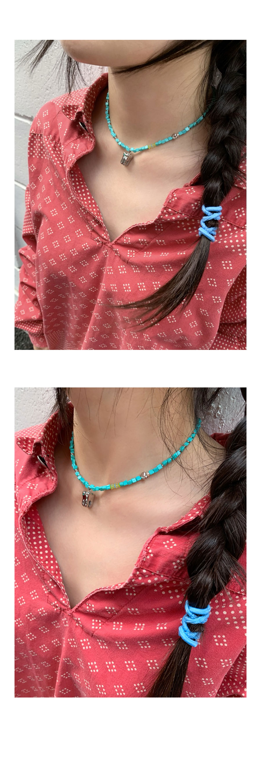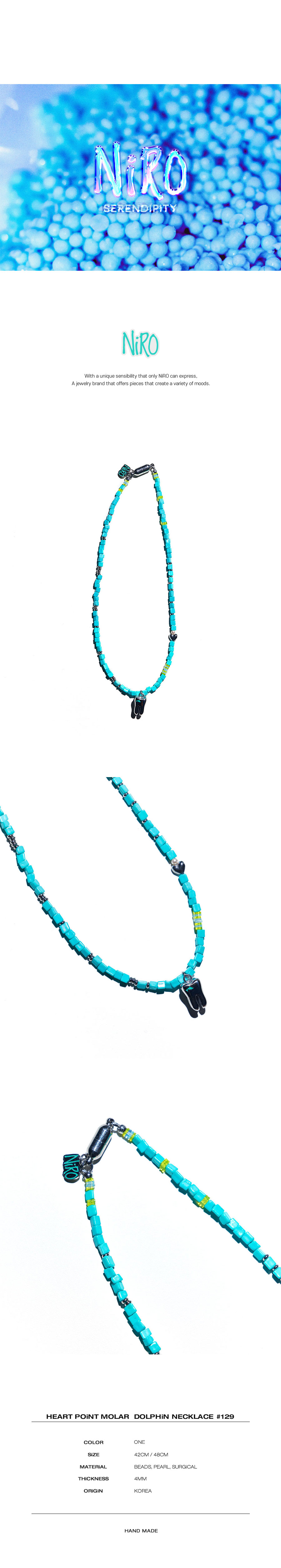 NiRO의 모든 제품은 핸드메이드로 주문 후 최대 10일 이내에 걸쳐 주문 제작됩니다. 민트색 비즈 스트랩과 하트참(써지컬), 진주, 블루 레몬 컬러의 비즈 디테일이 있으며, 니로의 어금니 참이 포인트인 목걸이입니다. 여성 추천 사이즈 42cm 남성 추천 사이즈 48cm