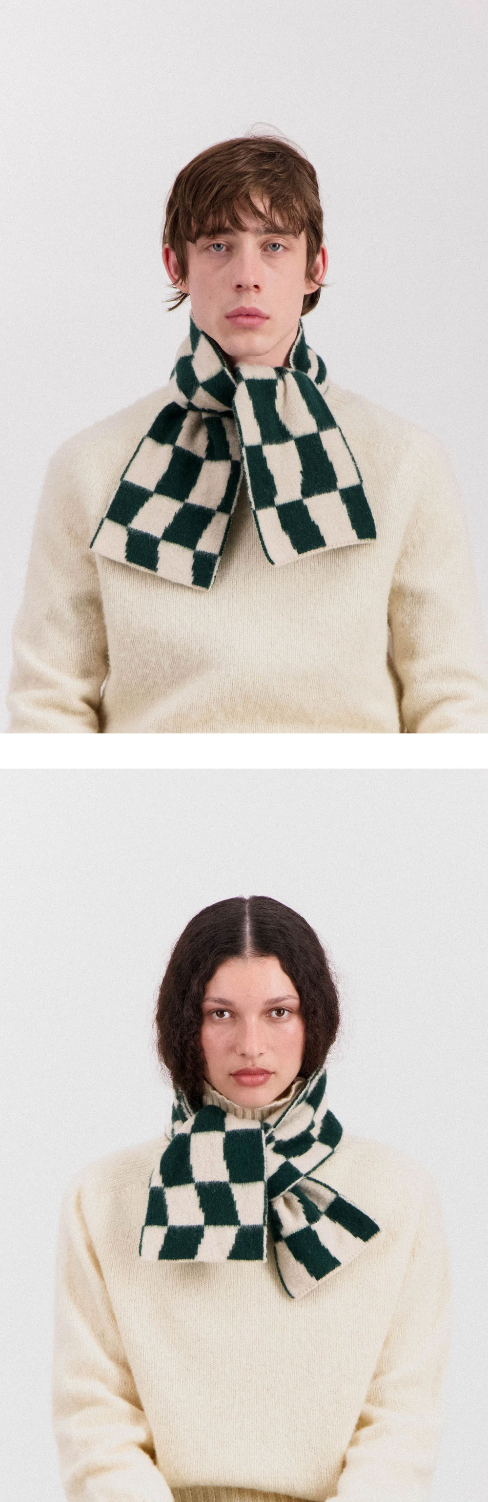 그래픽적인 감성과 천연 소재의 따뜻함이 조화를 이루는 하울린 미니 체커보드 스카프 포레스트입니다. - 100% 천연 램스울 사용 (메리노 품종 양의 첫 번째 이발에서만 얻어지는 가장 부드럽고 섬세한 울) - 천연 울은 통기성과 신축성, 체온 조절, 냄새 억제 기능까지 갖춘 지속 가능한 천연 섬유 - 전통적인 티즐(엉겅퀴) 브러싱 기법을 활용한 부드러운 텍스처 - 스코틀랜드 현지 제작 및 핸드 피니시 마감 - 원사이즈 (모두에게 잘 맞는 사이즈)