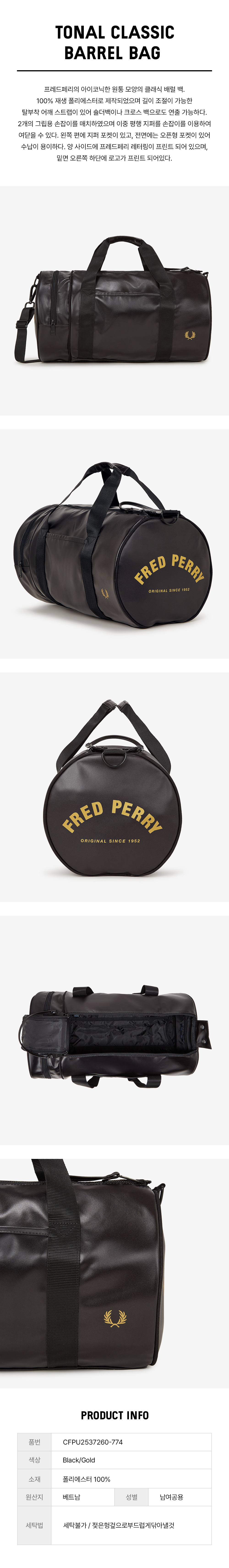 프레드페리 토널 클래식 배럴 백 블랙 골드