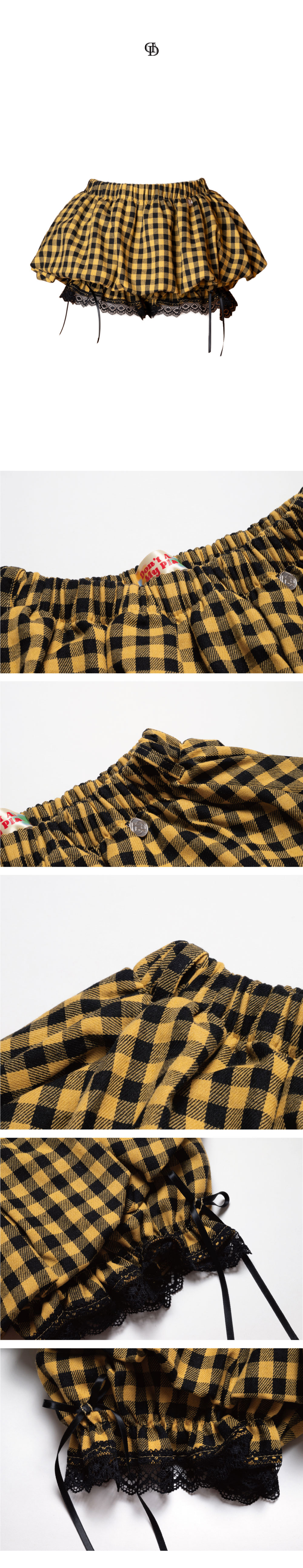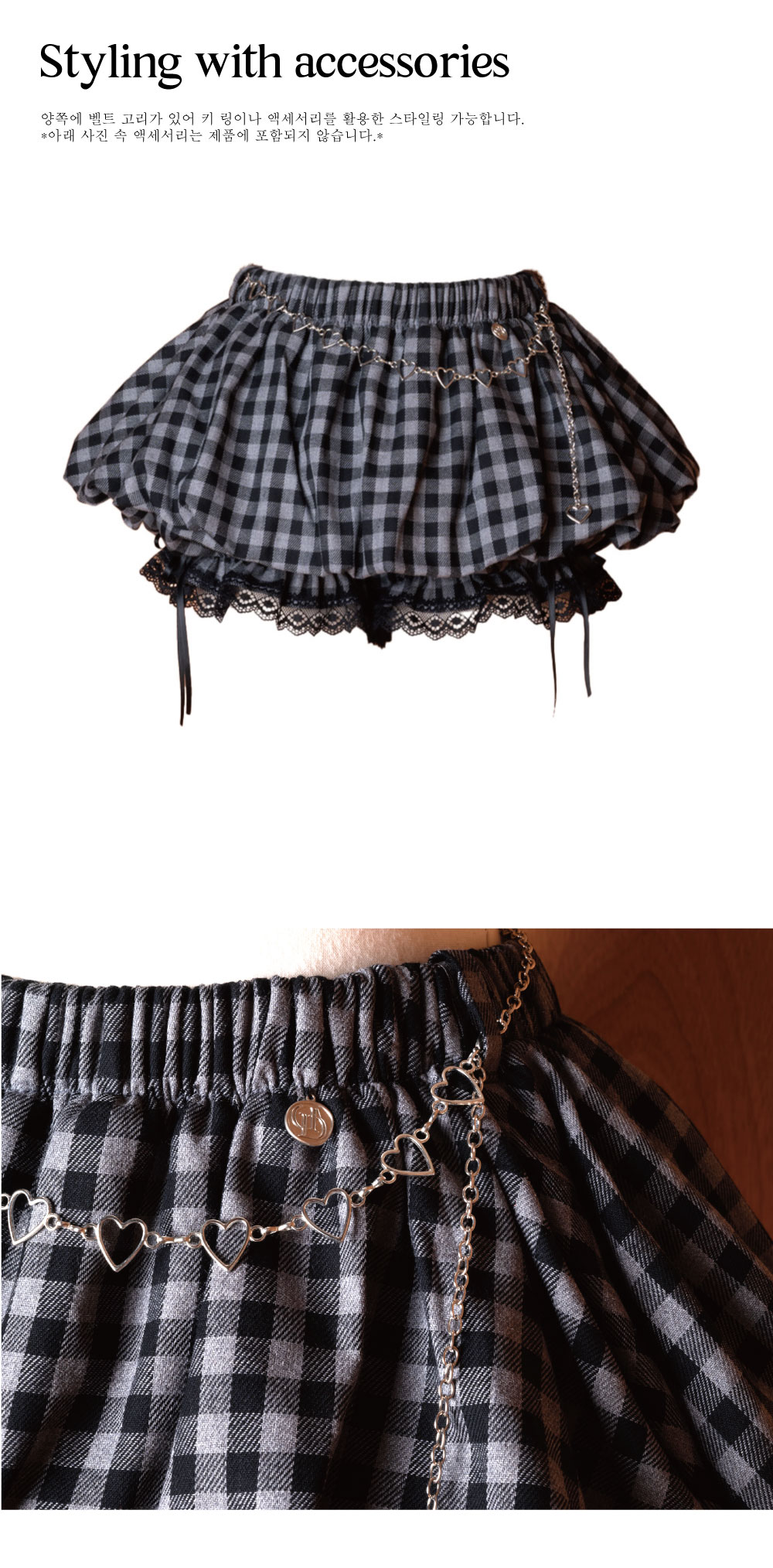 트렌디한 레이어드 디자인: 벌룬 스커트와 레이스 팬츠가 하나로 이어진 특별한 아이템 경쾌한 체크 패턴: 힙하고 발랄한 무드를 더하는 디자인 사랑스러운 디테일: 레이스와 리본 장식으로 완성한 섬세한 포인트 편안한 착용감: 신축성 좋은 밴딩으로 자유로운 활동 가능