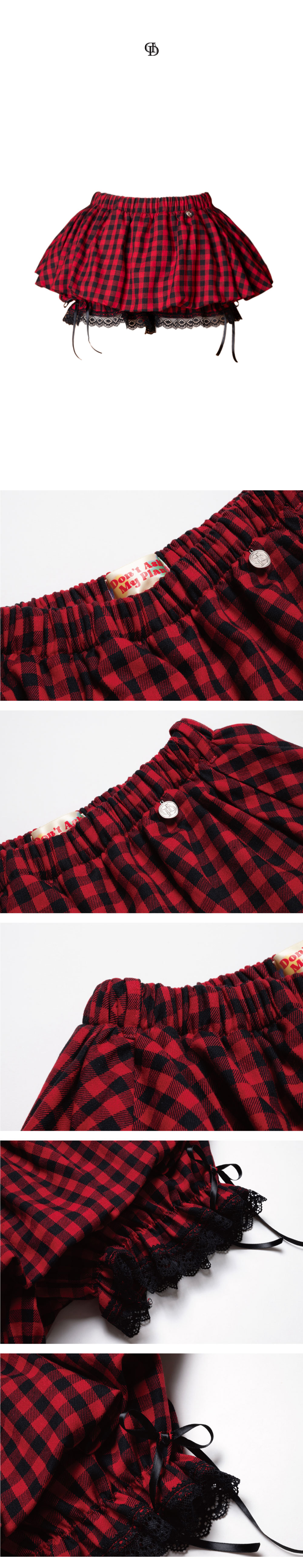 트렌디한 레이어드 디자인: 벌룬 스커트와 레이스 팬츠가 하나로 이어진 특별한 아이템 경쾌한 체크 패턴: 힙하고 발랄한 무드를 더하는 디자인 사랑스러운 디테일: 레이스와 리본 장식으로 완성한 섬세한 포인트 편안한 착용감: 신축성 좋은 밴딩으로 자유로운 활동 가능