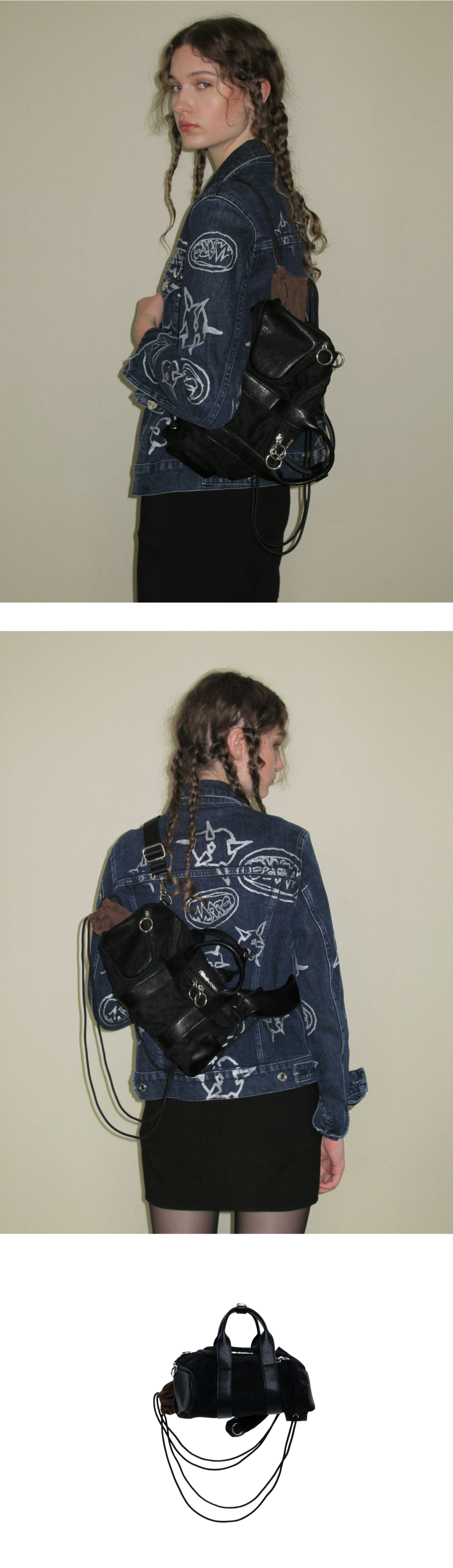 뮤지션들이 사용하는 긱 백에서 영감을 받은 3-way백 - 토트, 숄더, 백팩 등 다양한 스타일링이 가능한 디자인 - 부드러운 스웨이드 및 가죽 소재 배색 - 두 가지로 분리된 수납공간으로 다양하게 활용이 가능