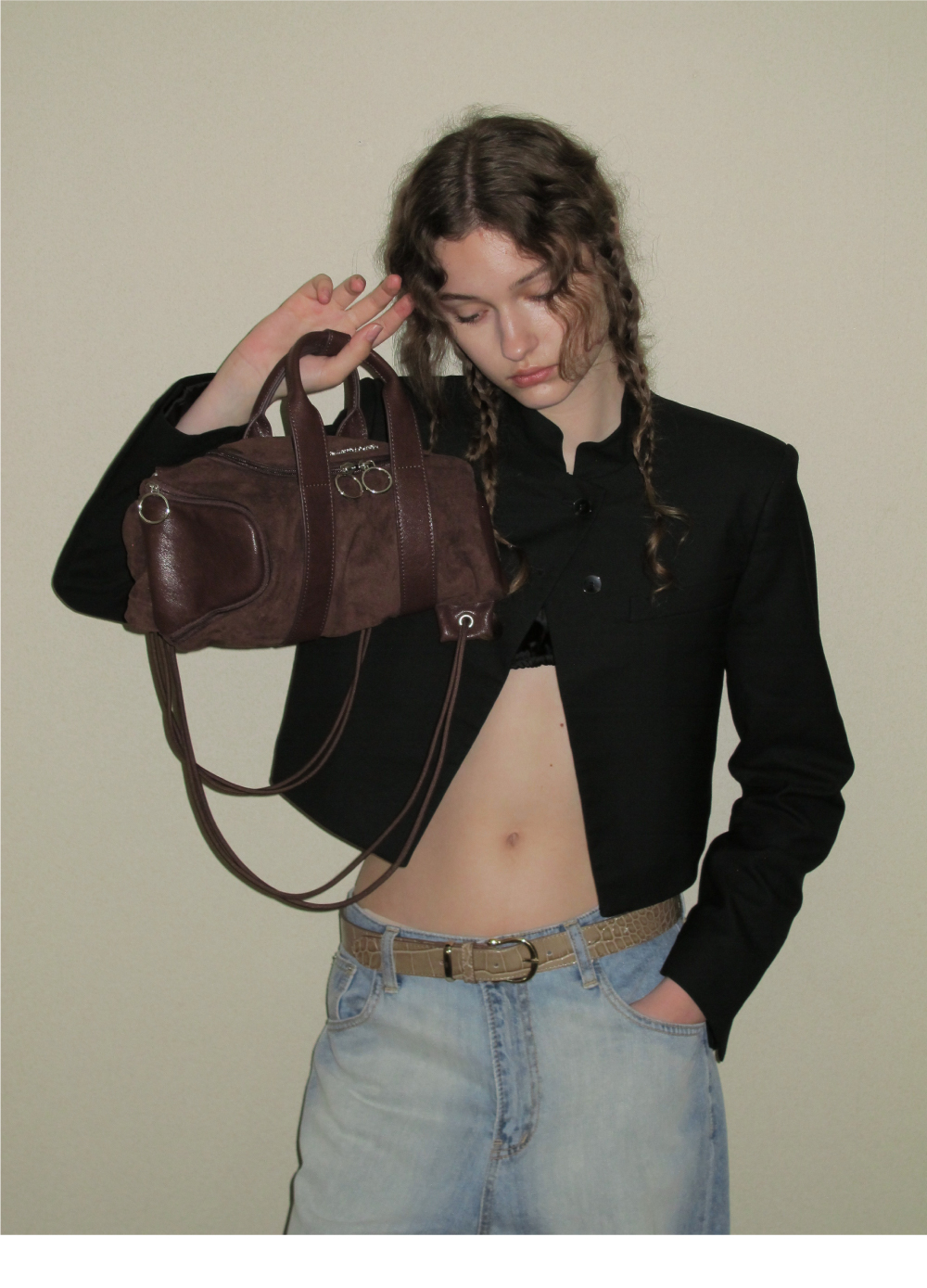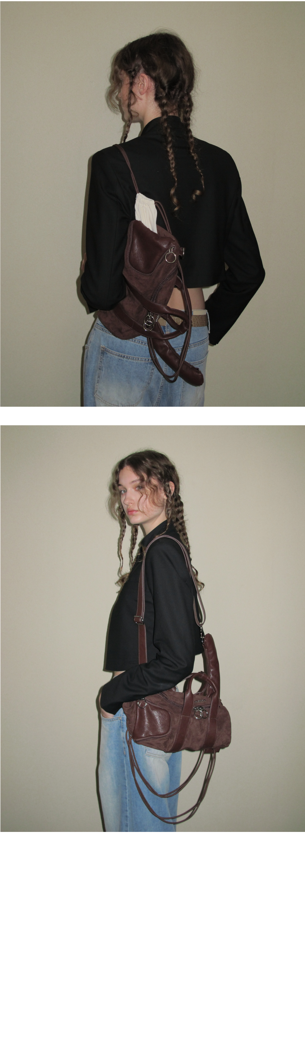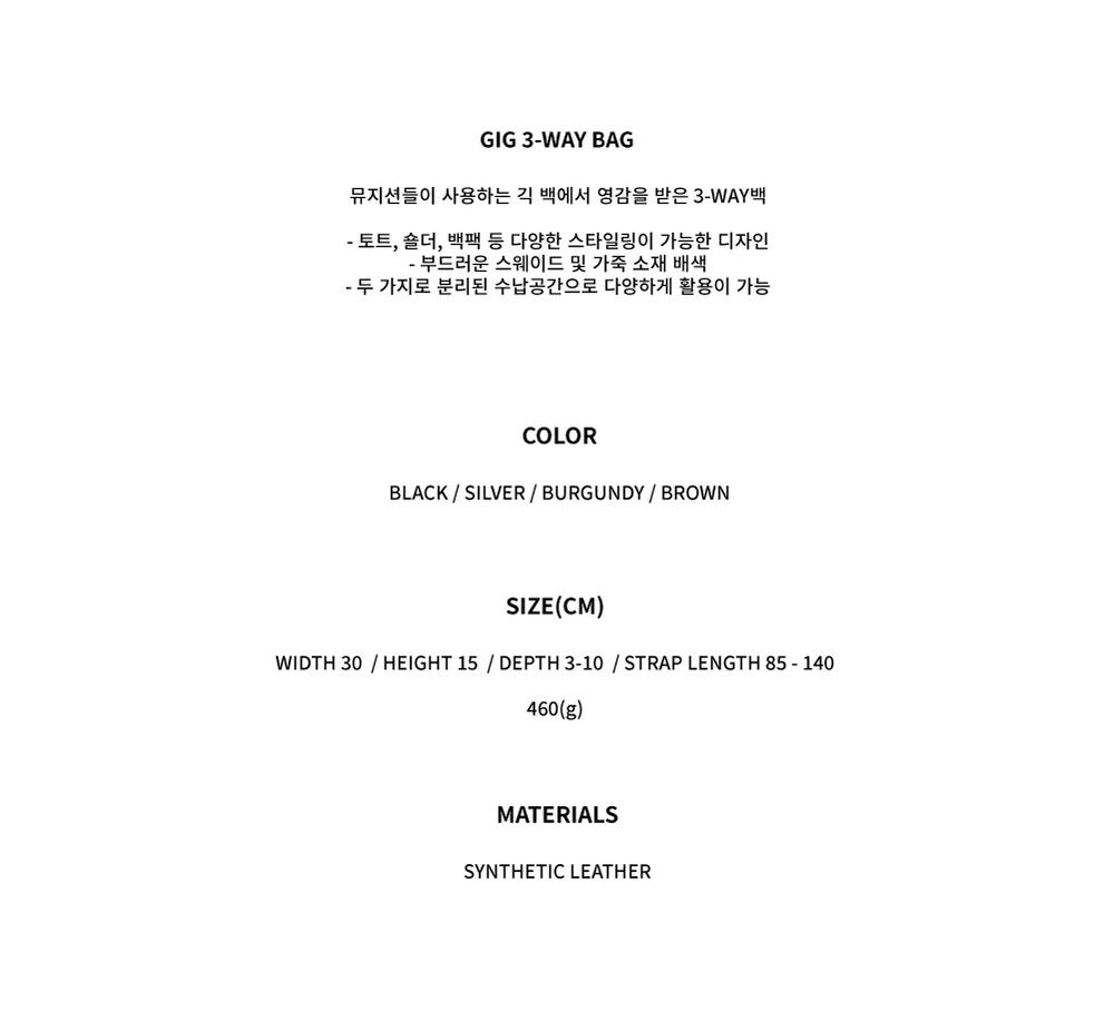 뮤지션들이 사용하는 긱 백에서 영감을 받은 3-way백 - 토트, 숄더, 백팩 등 다양한 스타일링이 가능한 디자인 - 부드러운 스웨이드 및 가죽 소재 배색 - 두 가지로 분리된 수납공간으로 다양하게 활용이 가능