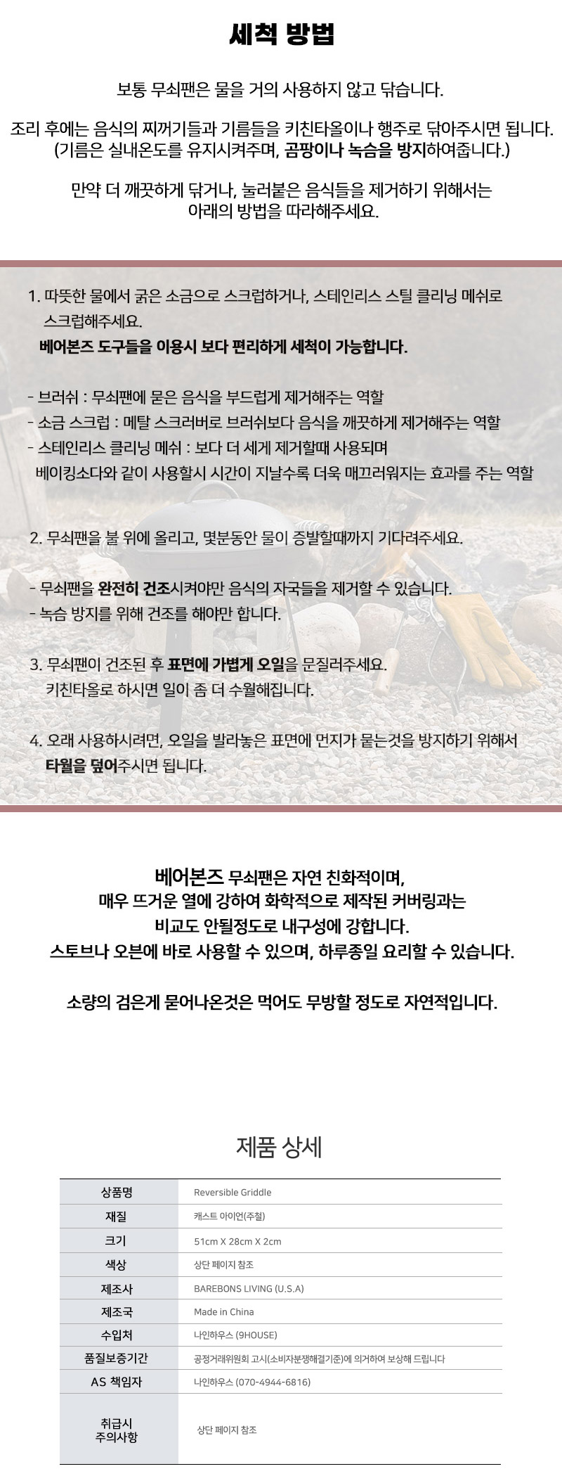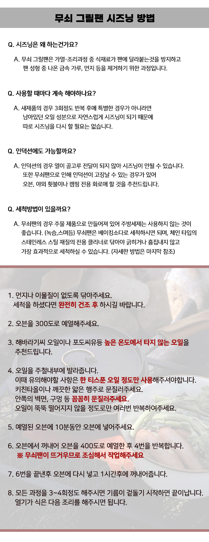 건조 후 시즈닝을 한 후 보관해주시길 바랍니다. / 표면에 먼지가 붙는것을 방지하기 위해서는 타월을 덮어주시면 됩니다.