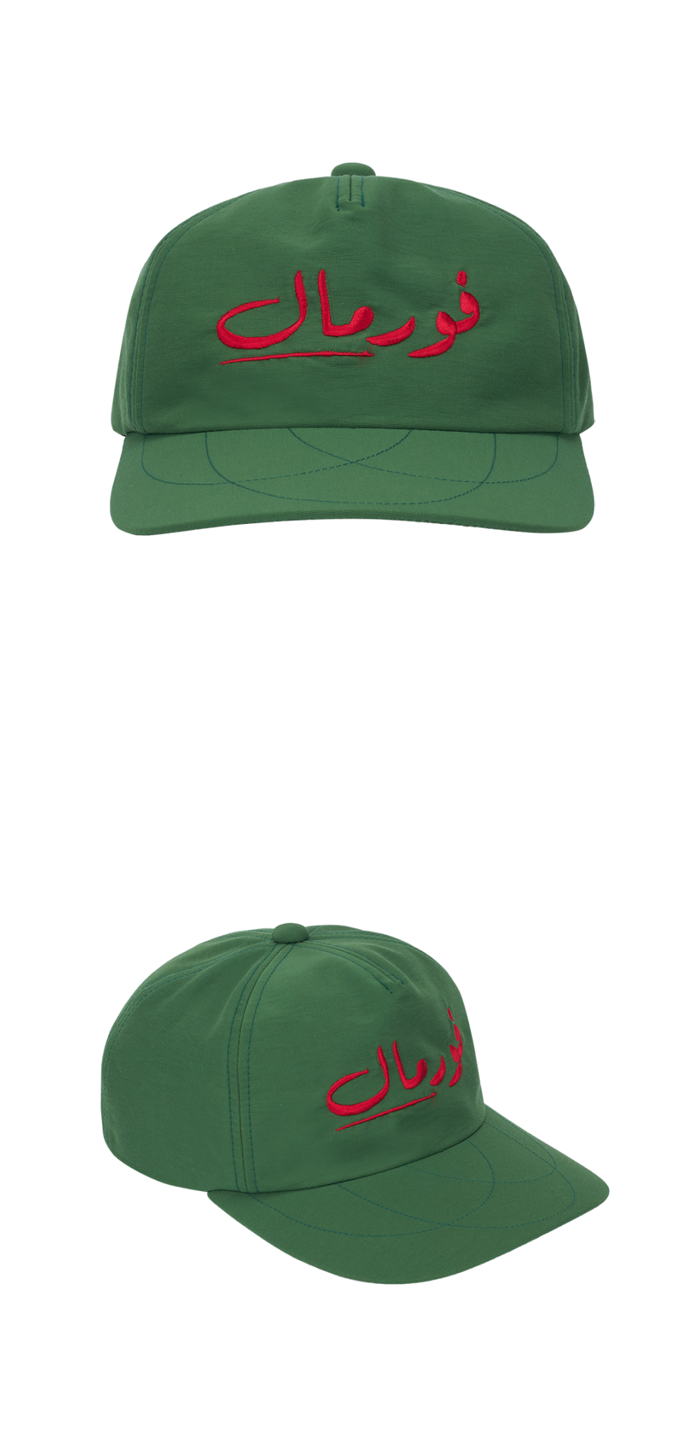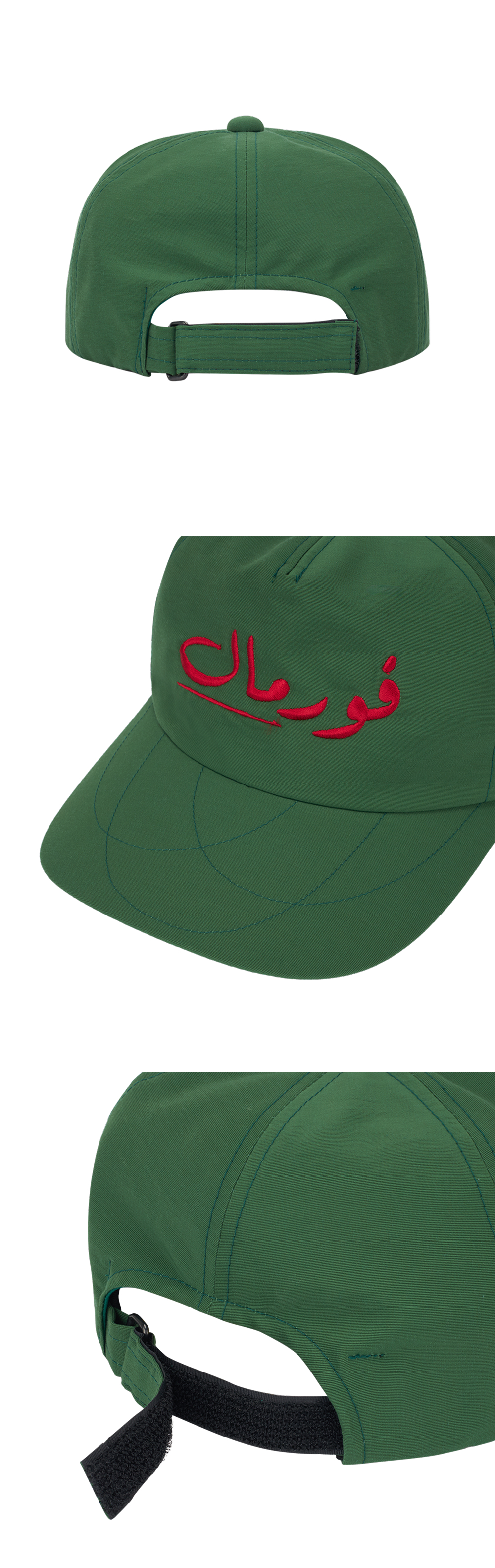 람로프 아라빅 포멀 캡 그린 입니다. - 브랜드명 LAMROF(Formal의 역철자)를 아라비아어로 자수한 디자인 - 그린 바탕에 레드 자수로 강렬한 대비감 - 모자챙의 원형 스티치 자수 디테일 포인트 - 깊은 6패널 실루엣로 안정적인 착용감