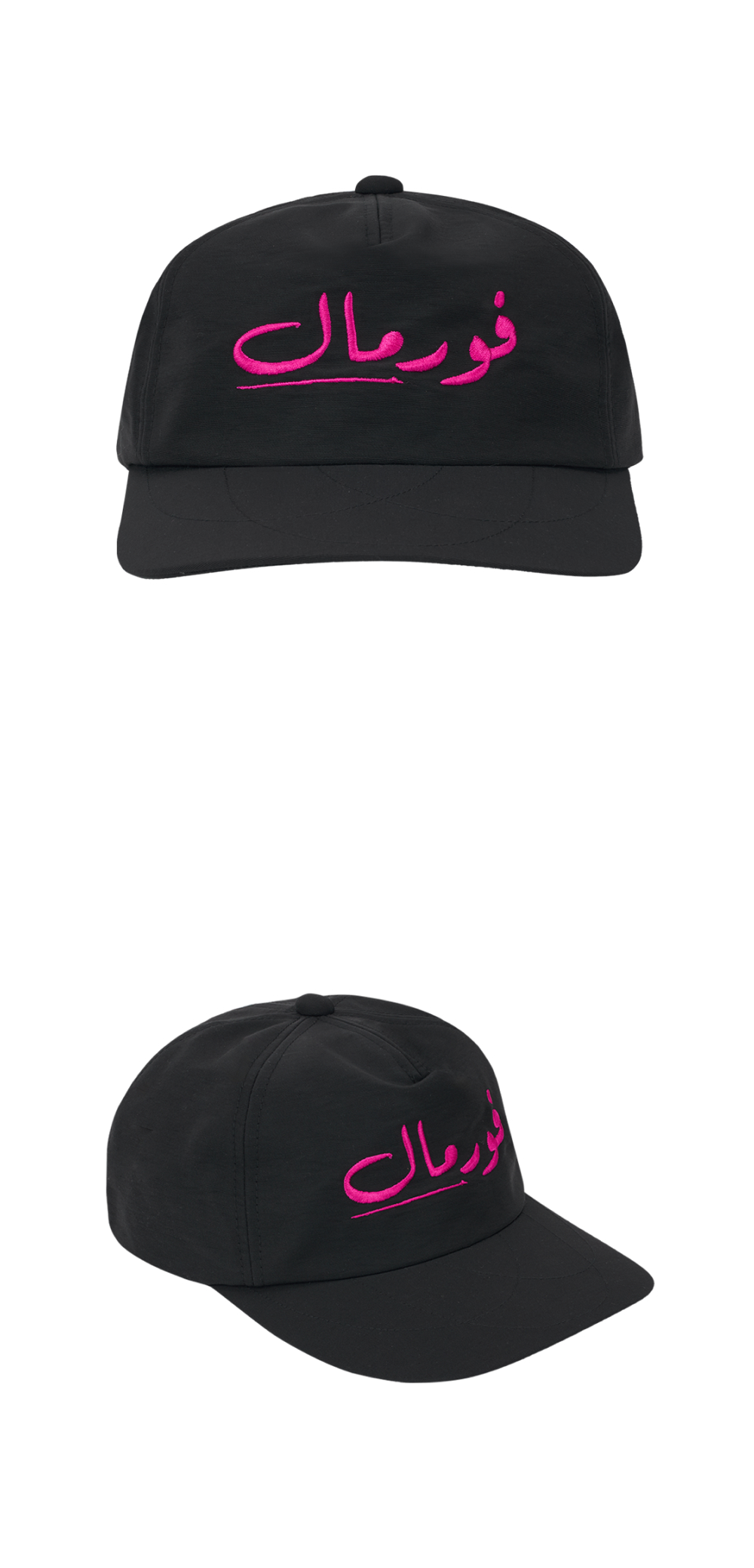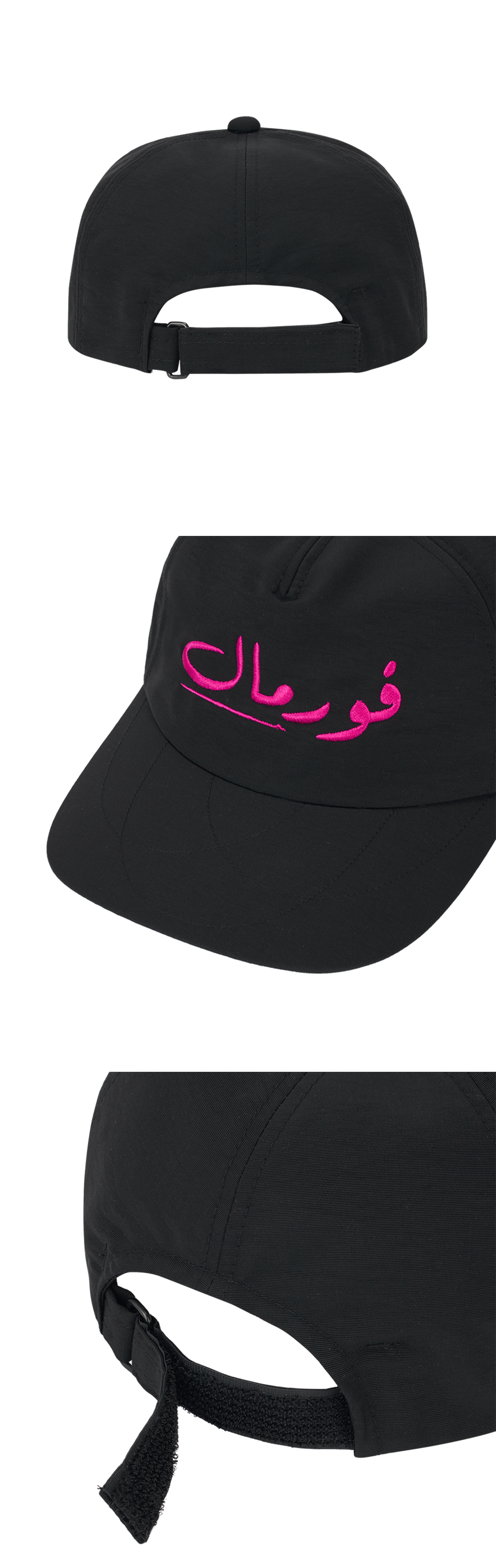 람로프 아라빅 포멀 캡 블랙입니다. - 브랜드명 LAMROF(Formal의 역철자)를 아라비아어로 자수한 디자인 - 블랙 바탕에 핑크 자수로 강렬한 대비감 - 모자챙의 원형 스티치 자수 디테일 포인트 - 깊은 6패널 실루엣로 안정적인 착용감