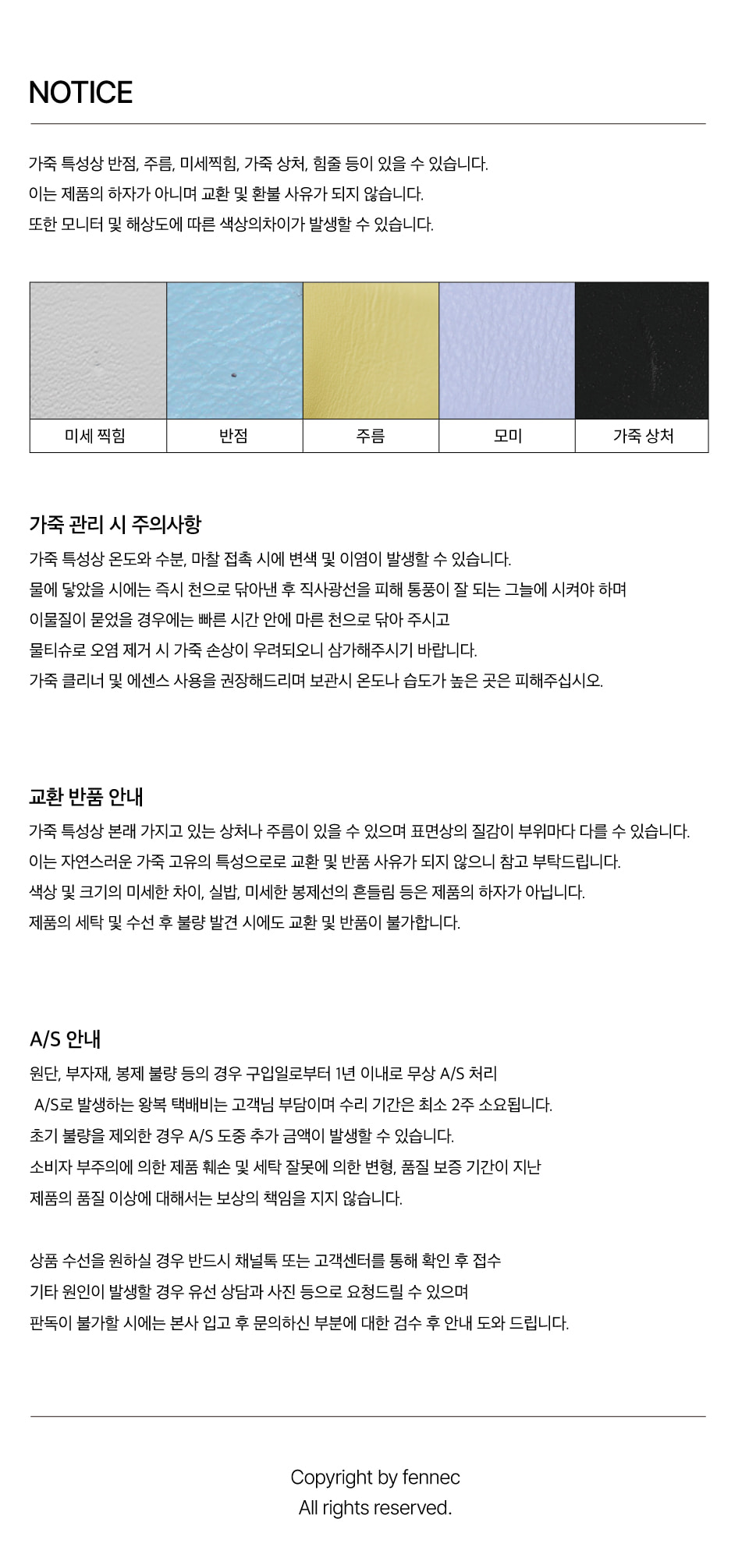 가죽 특성상 온도와 수분, 마찰 접촉 시에 변색 및 이염이 발생할 수 있습니다.물에 닿았을 시에는 즉시 천으로 닦아낸 후 직사광선을 피해 통풍이 잘되는 그늘에 건조물티슈로 오염 제거 시 가죽 손상이 우려될 수 있습니다.가죽 클리너 및 에센스 사용을 권장보관시 온도나 습도가 높은 곳은 피해주십시오