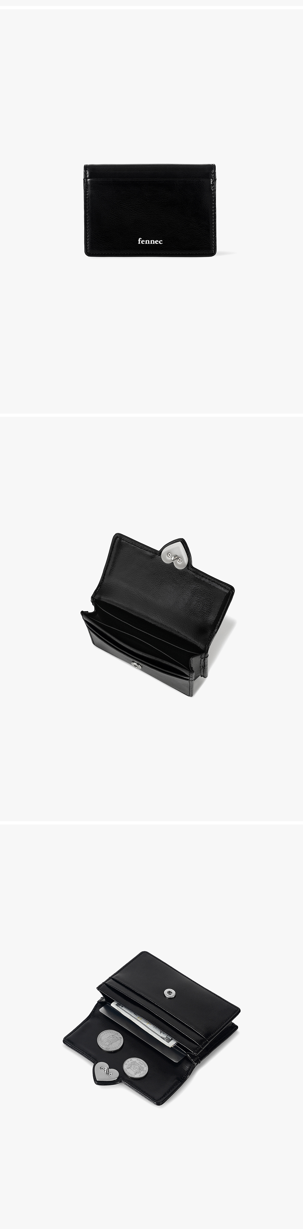 - 광택감이 돋보이는 크링클 텍스처 소가죽 사용 - 하트 로고 장식이 포인트 - 명함이나 카드를 넉넉하게 수납할 수 있는 포켓형 지갑 - 내부 카드칸 4, 외부 카드칸 1