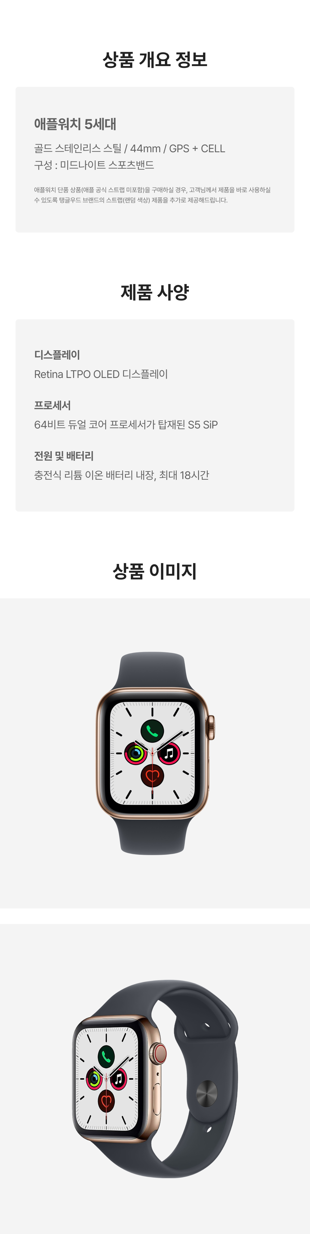 [S등급] 리퍼비시 애플워치 5 44mm 셀룰러 골드 스테인리스 스틸 케이스 스포츠 밴드 미드나이트