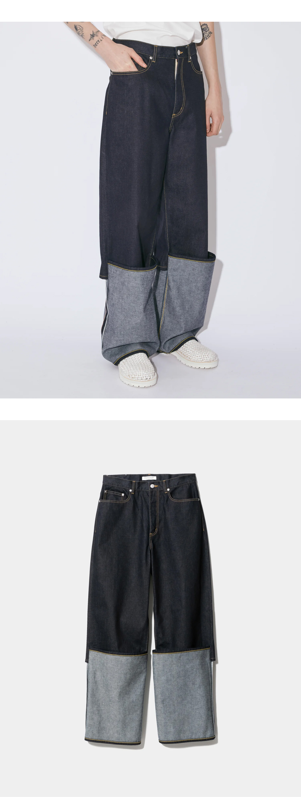 절개 아래 원단을 뒤집어 배색 효과를 준 투톤 컬러 디테일의 뷰티풀 피플 우먼 셀비지 데님 플립 헴 팬츠 인디고입니다. - 브랜드의 시그니처인 12온스 셀비지 데님 사용 (원워시 처리) - 클래식한 5포켓 스타일 - 살짝 로우라이즈 웨이스트 - 깊은 밑위와 여유 있는 힙라인으로 편안한 착용감 - 무릎부터 밑단까지 일자로 떨어지는 와이드 스트레이트 실루엣 - 뒷 허리 밑에는 씬치 백(조절 버클) 디테일 추가 - 밑단을 접은 듯한 트롱프뢰유(Trompe-l'œil) 디자인으로 실제로 롤업하지 않아도 롤업한 듯한 연출 가능 - 오른쪽 허리 부분의 가죽 네임 태그가 포인트