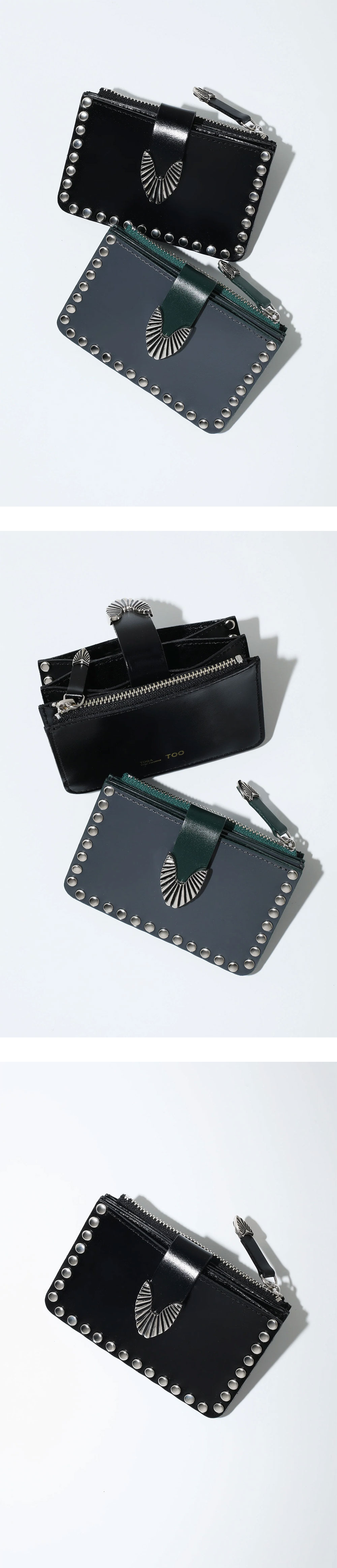스터드가 매력적인 토가 투 레더 월렛 스터드 블랙입니다. - 카드 슬롯, 코인 포켓, 지폐용 포켓 - 스냅 버튼 여밈 - 소가죽 지갑