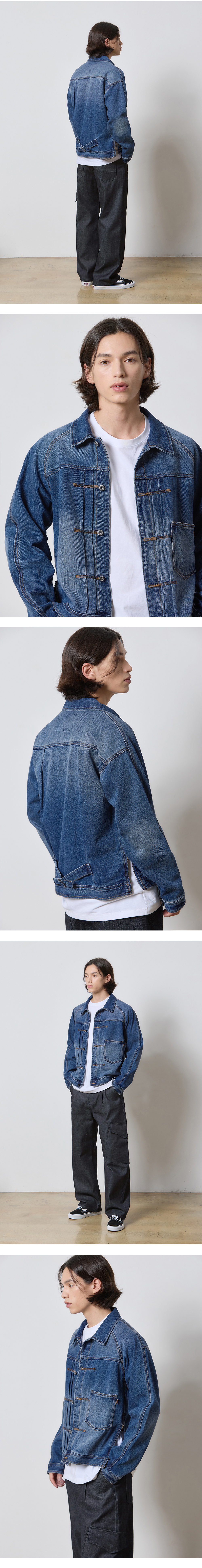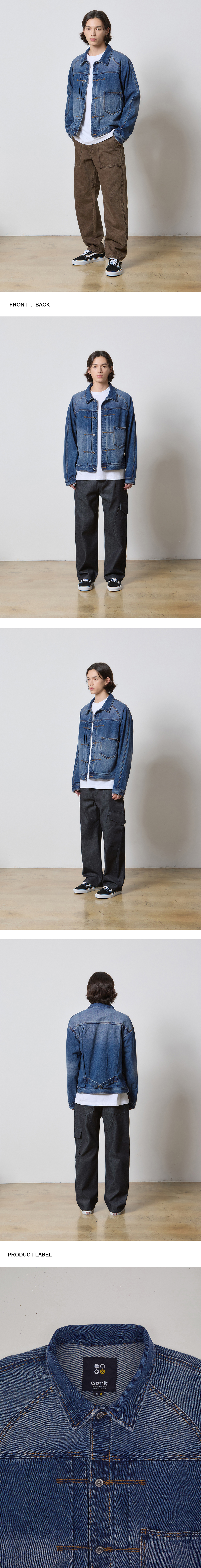 -CORK DENIM COLLABORATION COLLECTION 상품입니다. 앞쪽의 투턱과 등판의 턱주름으로 활동성이 좋은 자켓입니다. 고정 스티치로 정통 빈티지 스타일을 보여주는 제품입니다. 옆선의 지퍼 디테일로 다양한 연출이 가능합니다.