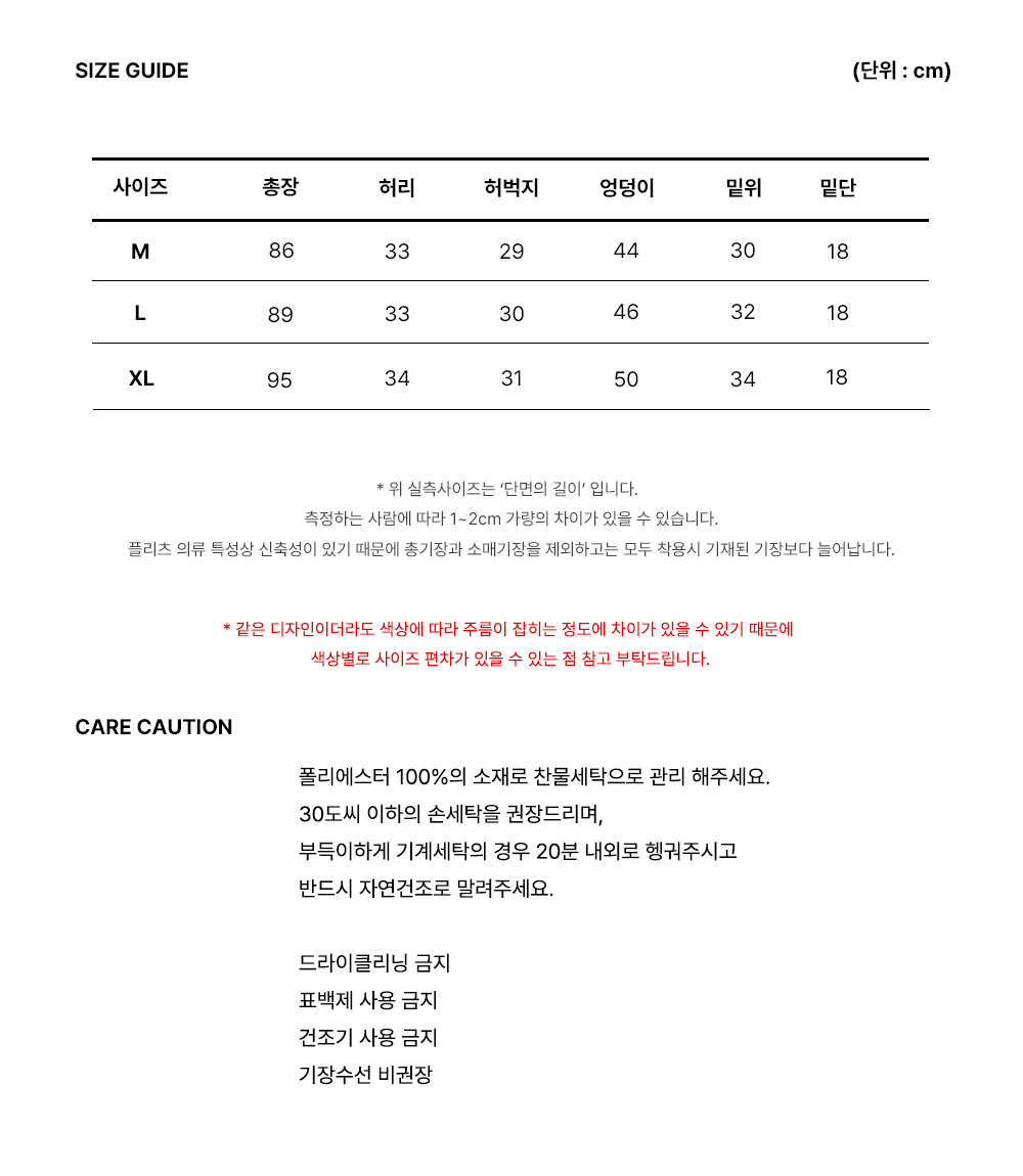 사이즈 정보 (단위:cm)사이즈1.총장2.허리3.허벅지4.엉덩이5.밑위6.밑단M863329443018L893330463218XL953431503418- 위의 실측사이즈는 '단면의 길이'입니다. 참고해 주세요.- 사이즈는 측정방법에 따라 1~3cm 정도 오차가 있을 수 있습니다.- 제품색상은 사용자의 모니터의 해상도에 따라 실제 색상과 다소 차이가 있을 수 있습니다.- 제품컷의 색상이 실제 제품 색상과 가장 비슷합니다. 상세정보 소재 폴리에스테르 100% 세탁방법단독손세탁세탁기가능비틀기금지표백금지그늘에건조색상라이트 베이지제조사자체제작제조일자2023-08-31원산지중국A/S정보 및 담당자MONPLISSE 고객센터/02-574-7770