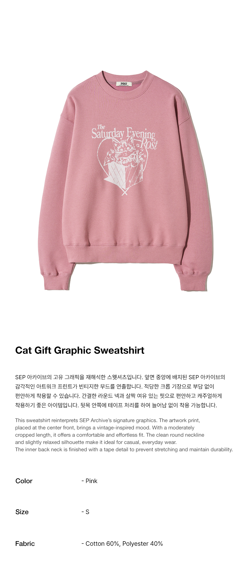 더 세터데이 이브닝 포스트 캣 기프트 그래픽 스웨트 셔츠 핑크
