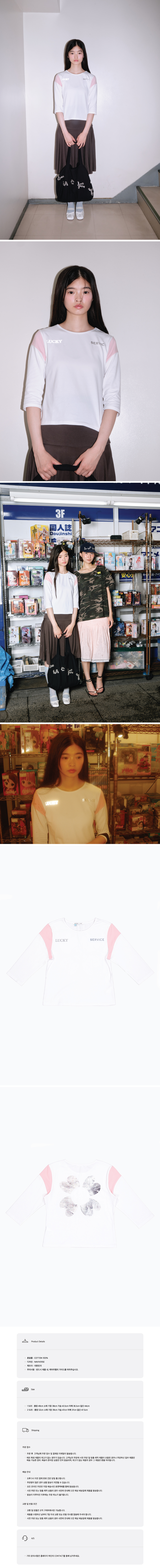 • 어깨 배색 원단 • Lucky Service 필름 인쇄 • 7부 실루엣 • 클로바 필름 인쇄 • 모델 착용 사이즈 1