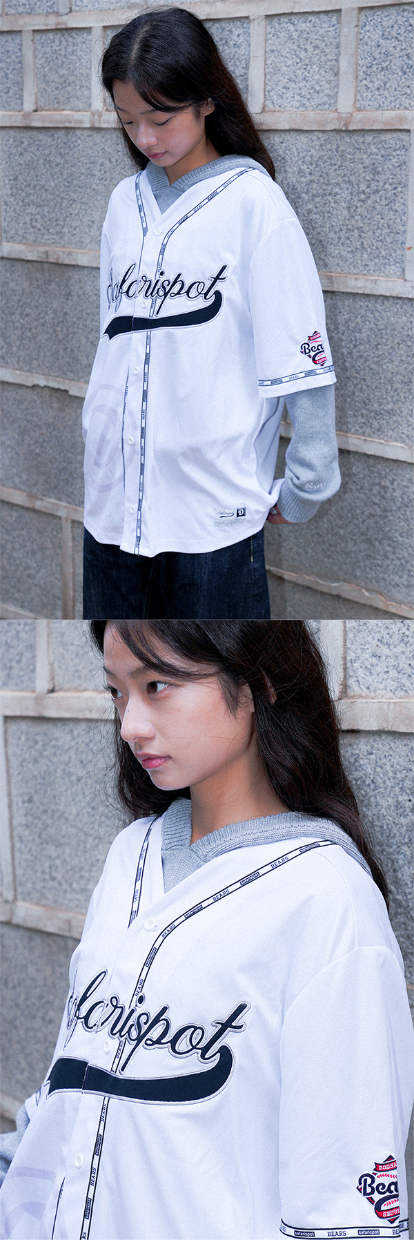 앞면에는 Safarispot 로고 자수와 파이핑 라인이 들어가 있어 클래식한 야구 저지 감성을 살렸으며, 뒷판에는 두산 베어스의 상징적인 마스코트 철웅이 일러스트가 프린트되어 있어 팬심을 드러낼 수 있는 유니크한 포인트입니다. W MODEL : 159CM, SIZE: 1 M MODEL : 176CM, SIZE: 2