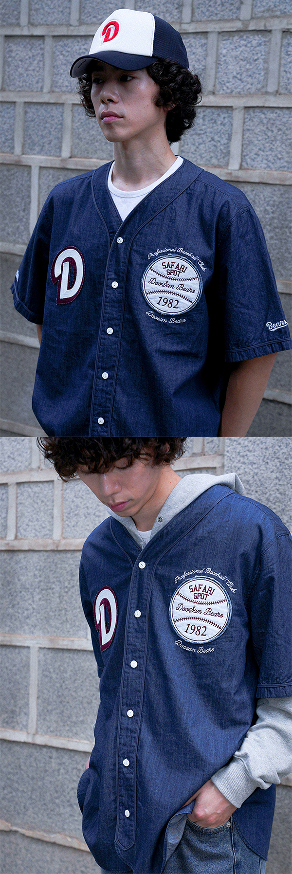 자연스러 워싱감의 데님 원단을 사용해 캐주얼하면서도 유니크한 분위기를 연출하였으며, 전면의 패치워크와 자수 그래픽으로 베이스볼 저지 특유의 감성을 더한 제품입니다. W MODEL : 159CM, SIZE: 1 M MODEL : 176CM, SIZE: 2