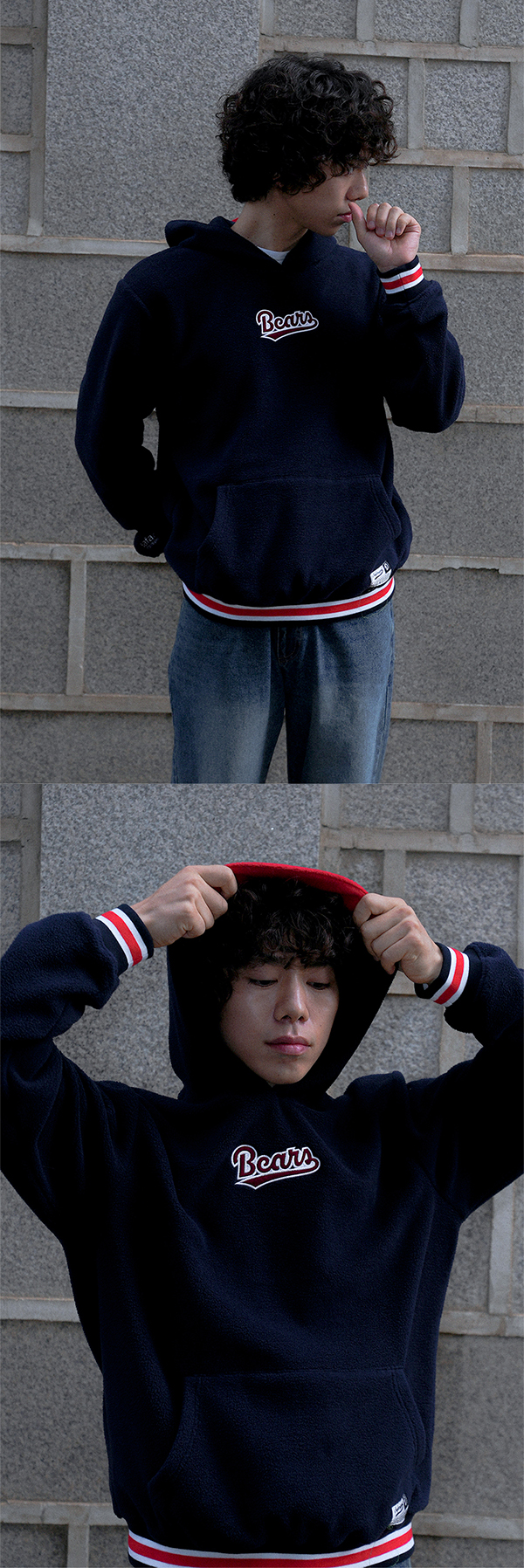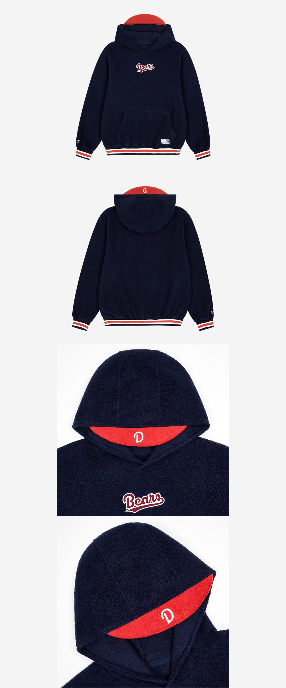 부드러운 플리스 소재로 보온성이 뛰어납니다.베이스볼 무드 디자인으로 전면의 Bears 자수와 스트라이프 시보리 디테일로 스포티하고 레트로한 감각을 강조한 제품입니다. W MODEL : 159CM, SIZE: 0 M MODEL : 176CM, SIZE: 0