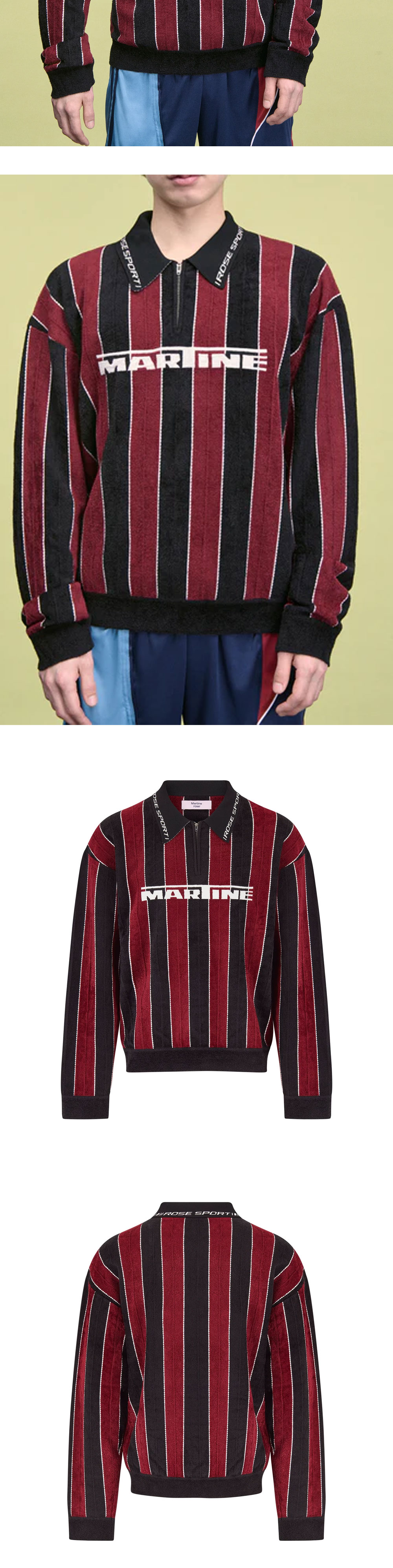 스트라이프 패턴이 돋보이는 마틴 로즈 스포티 로고 폴로 블랙 버건디입니다. - 여유로운 릴랙스 핏의 오버사이즈 실루엣 - 리브드 커프로 안정감 있는 착용감 - 폴드 다운 칼라와 3/4 지퍼 클로저 디테일 - 가슴과 칼라에 더해진 시즌 브랜디드 아트워크 포인트