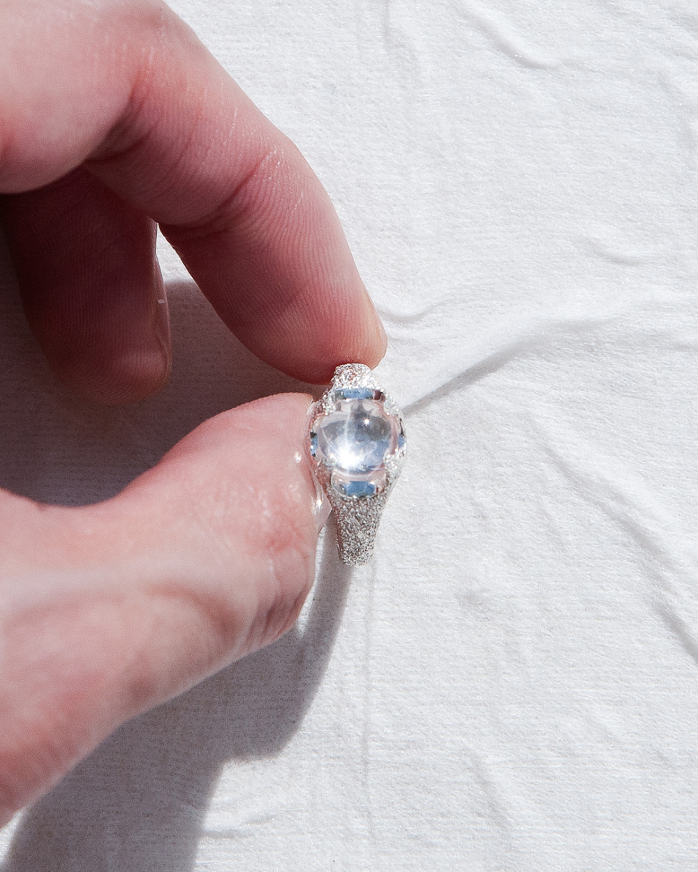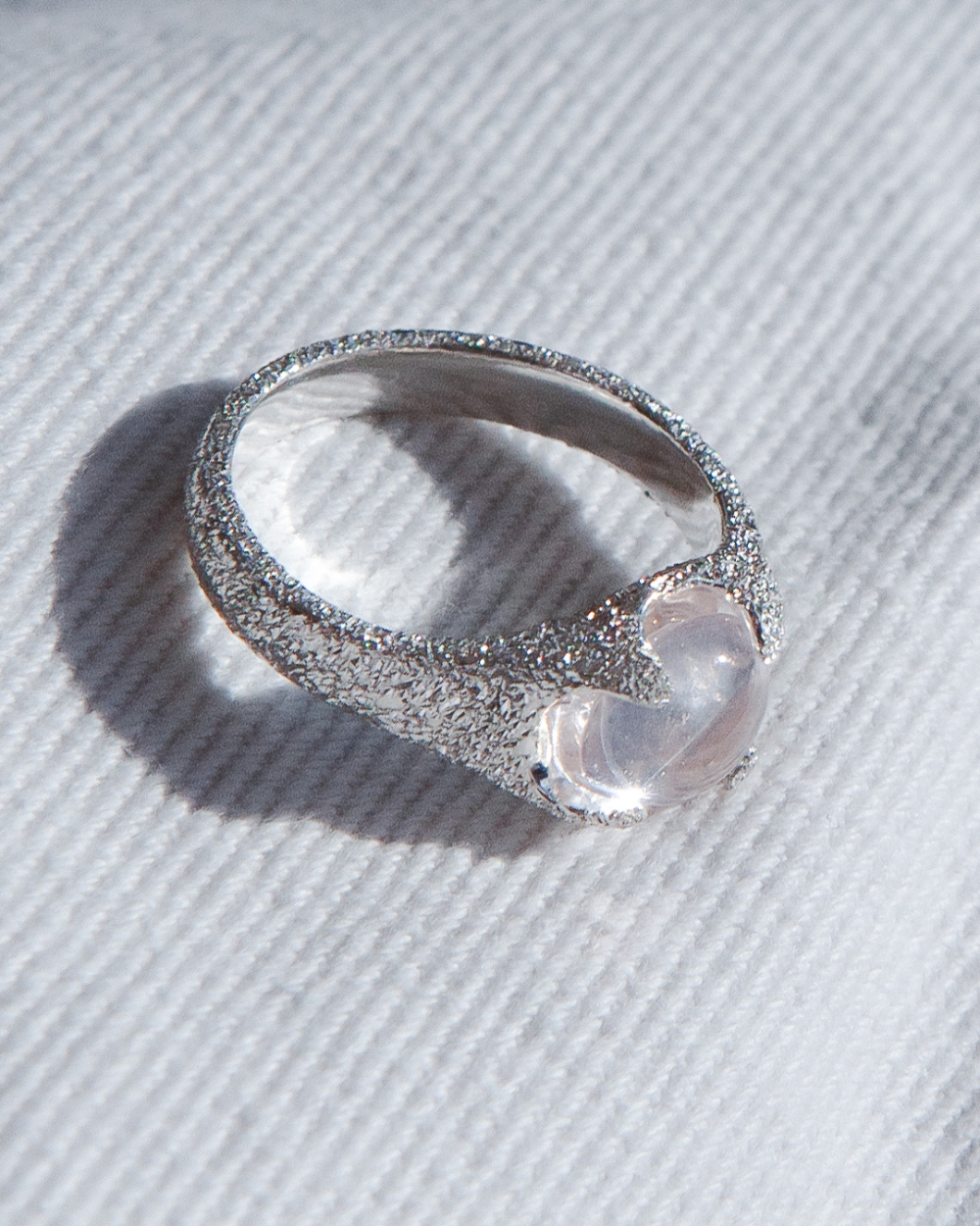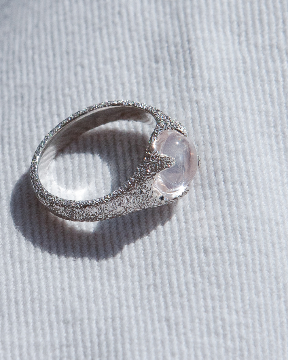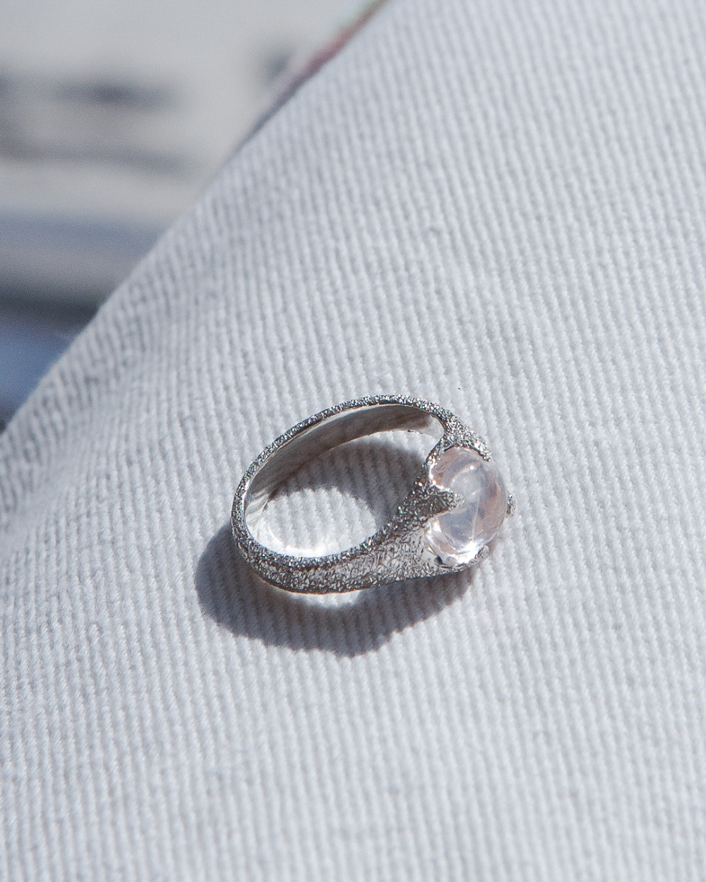 ‘Swallow Ring’은 AAA 등급의 8mm 스타 로즈쿼츠를 세팅한 925 스털링 실버 반지입니다. AAA는 투명도와 색감이 뛰어난 상위 보석에만 부여되는 등급이며, 빛을 받으면 별 모양의 빛줄기가 드러나는 스타 로즈쿼츠를 사용했습니다. 밴드 표면은 금속 위에 미세한 입자를 입혀 질감을 표현하는 그라니토(Granito) 기법으로, 실버의 반짝임이 여러 각도에서 살아나 손끝에 입체적인 빛을 입힙니다. Material: 925 Sterling Silver, Star Rose Quartz