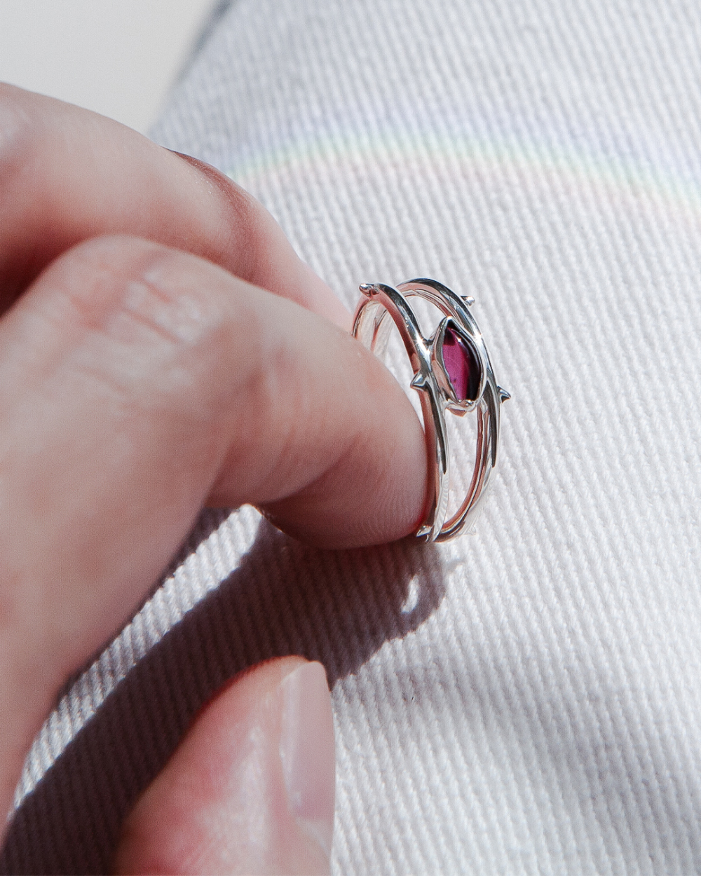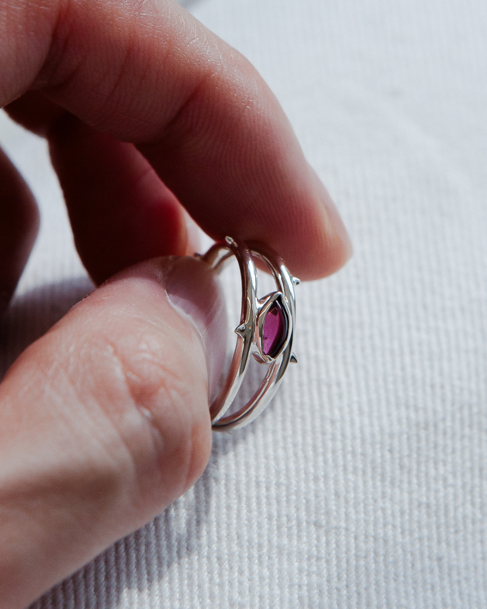 두 줄기의 가시가 붉은 원석을 감싸 쥐는 형태의 Thorn Garnet Ring입니다. 선명한 라즈베리 빛의 로돌라이트 가넷을 사용하여 금속의 날카로움과 스톤의 투명한 색감을 대비시켰습니다.