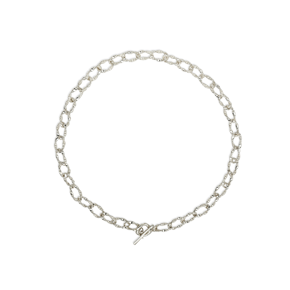가시덤불의 형상을 엮어낸 Bramble Necklace입니다. 수작업으로 제작된 실버 체인은 소재 특유의 무게감을 가감 없이 전달합니다. 입 모양과 가시 줄기를 결합한 토글 바(Toggle bar)는 잠금 장치인 동시에 목걸이 전면의 구조적인 핵심이 됩니다.