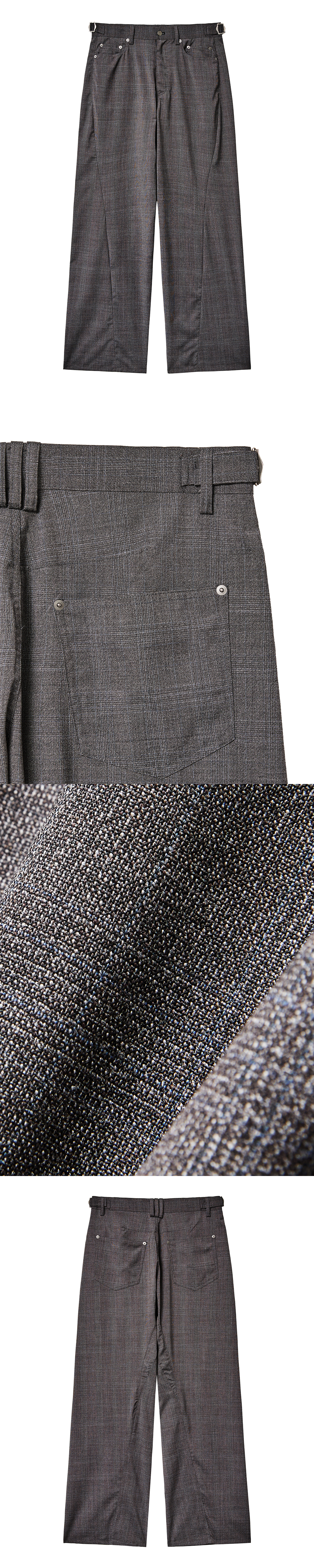 입체적인 트위스트 형태의 심라인으로 제작된 스트레이트 팬츠입니다. 은은한 체크 패턴의 울 소재를 사용하여 고급스러운 무드를 보여줍니다. 레귤러한 실루엣의 스트레이트 팬츠로 편하면서도 스타일리시한 연출이 가능한 제품입니다. -DETAIL- 레귤러 핏 입체적인 트위스트 심라인 허리 양 사이드 조절이 가능한 벨티드 디테일 리벳 디테일