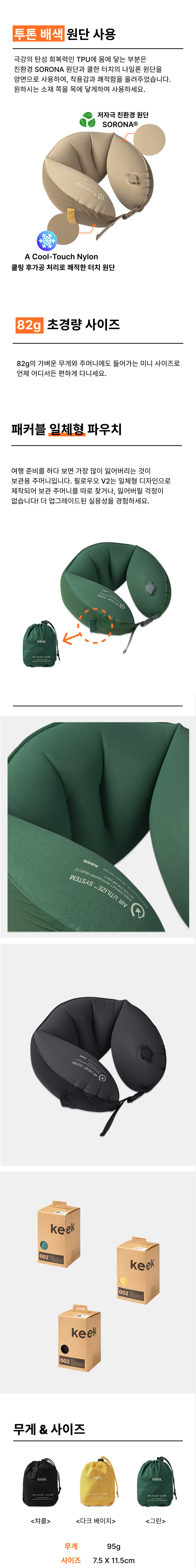 냉감 기능성 소재인 'SORONA COOL TOUCH' 원사를 사용한 PU 소재를 적용하여, 착용 시 시원하고 쾌적한 감촉을 제공합니다. 피부에 닿는 부분은 부드럽고 신축성이 뛰어난 소재로 제작되어, 땀과 유분에도 쾌적함을 유지하며, 친환경 섬유를 사용해 아이도 안전하게 사용할 수 있습니다. 사용법은 간단합니다. 밸브를 열고 공기를 주입하면 즉시 목베개로 활용할 수 있습니다. 82g의 초경량 무게에도 최상의 편안함을 제공하도록 설계된 인체공학적 3D 디자인은 이동 중에도 안정적인 휴식을 보장합니다. 사용하지 않을 때는 내장 포켓에 깔끔하게 수납할 수 있어 휴대성과 보관의 편리함을 더했습니다. 환경을 생각한 혁신적 설계와 지속 가능한 소재를 적용한 에어 넥 쿠션은 편안함과 친환경적 가치를 동시에 실현합니다. ※ 에어 주입 후에는 개인의 목 형태에 맞게 조절하여 사용하시기 바랍니다.