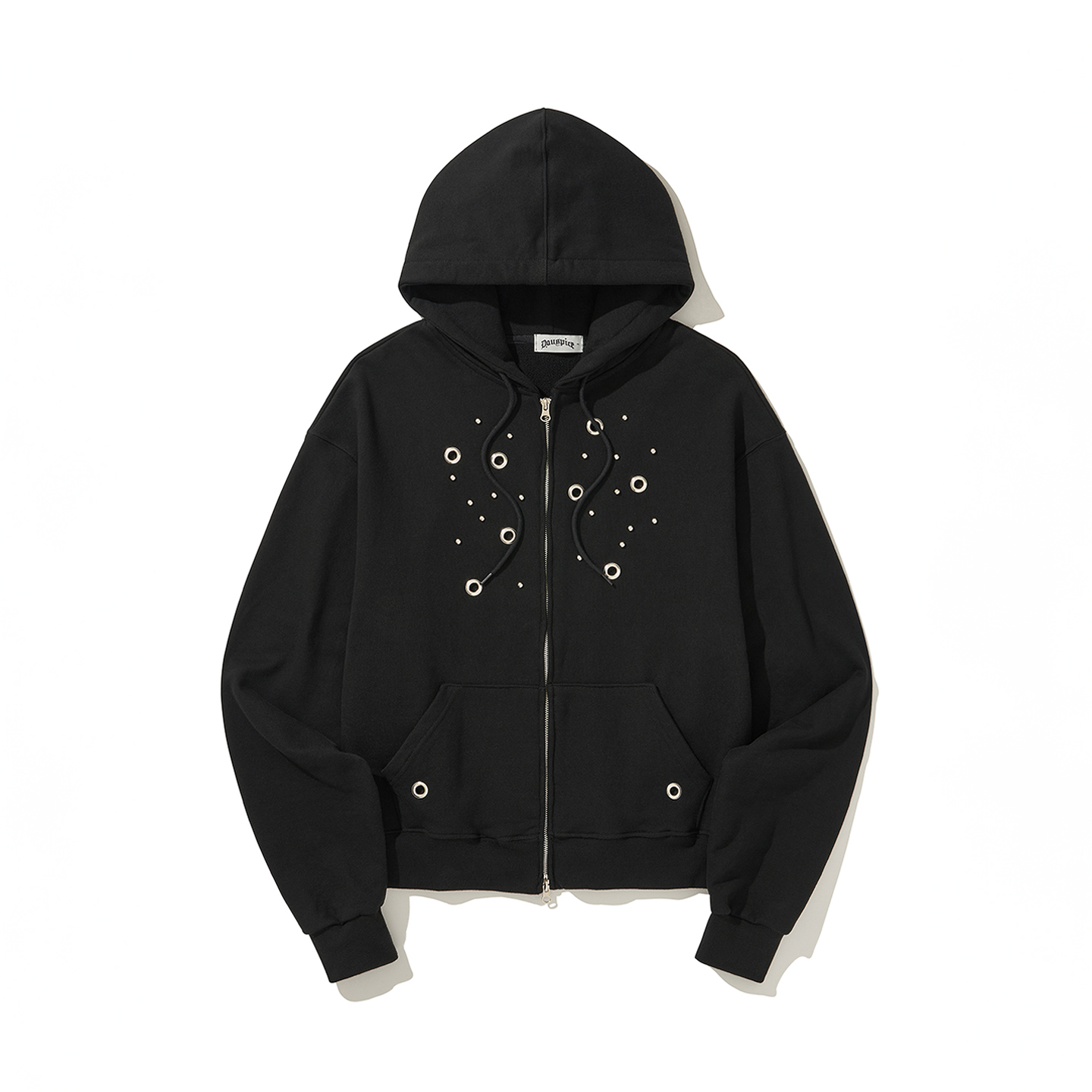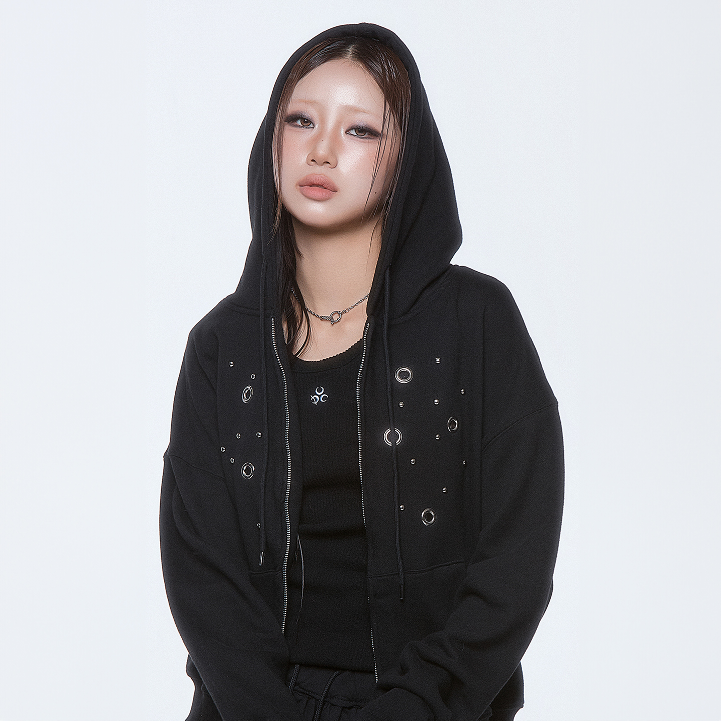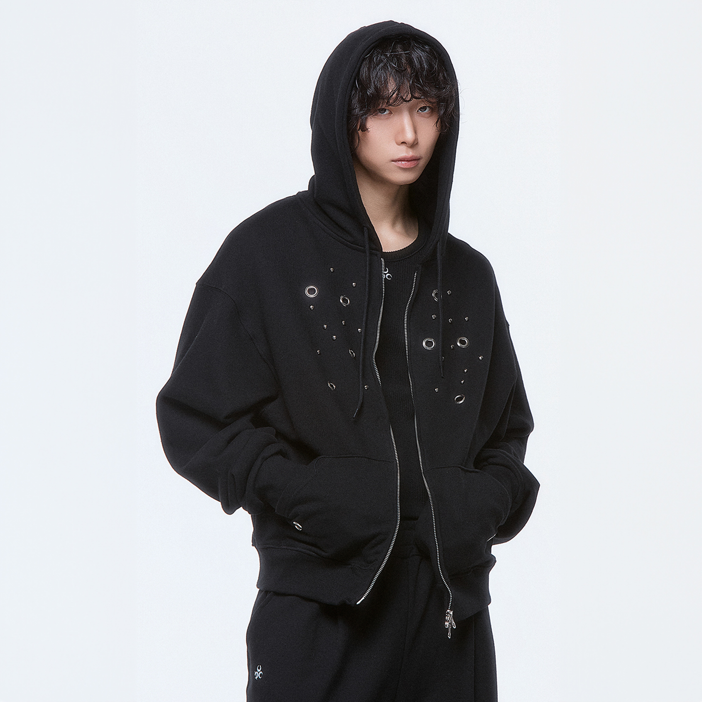 Product Description. ㆍ사이즈별 실루엣 연출 ㆍ1사이즈: 세미 크롭핏 ㆍ2사이즈: 레귤러 핏 ㆍ전면 랜덤한 배치의 아일렛과 스터드 디테일 ㆍ탄탄한 중량감의 쮸리 원단 ㆍ2way 지퍼 Product Size & Info. Size : 1, 2 Size Color : Black, Gray Material : Cotton 80%, Polyester 20% 1 Size : Length 59 / Shoulder 62 / Chest 52 / Hem 38 / Sleeve Length 66 2 Size : Length 64 / Shoulder 65 / Chest 55 / Hem 50 / Sleeve Length 68 Model Spec. Man : 174cm (2 Size 착용) Woman : 170cm (1 Size 착용) MADE IN KOREA.