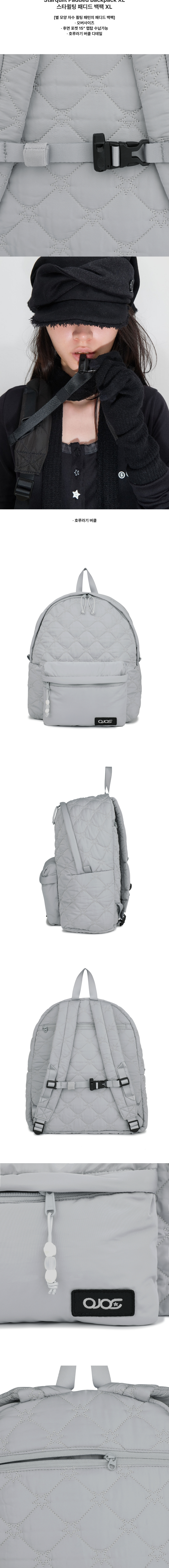 별 모양 자수 퀼팅 패턴의 패디드 백팩 | 오버사이즈 | 전면 포켓쪽 OJOS 로고 패치 라벨 | 부드러운 텍스처의 별 모양 자수 퀼링 소재 | 후면 포켓 15" 랩탑 수납가능 | 전면 보조포켓 | 호루라기 버클 디테일 | 추가 웨빙 스트랩으로 실용성 강화 | 일상용과 여행용으로 모두 적합한 캐주얼 백팩