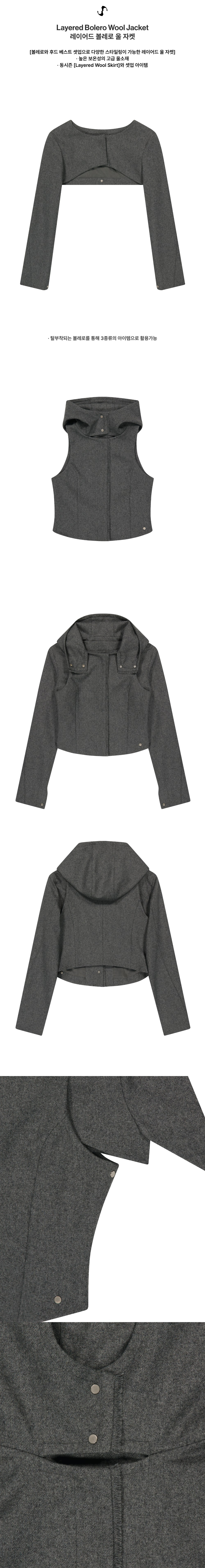 볼레로와 후드 베스트 셋업으로 다양한 스타일링이 가능한 레이어드 울 자켓 | 세미크롭의 슬림핏 | OJOS 로고 버튼 디테일 | 높은 보온성의 고급 울소재 | 탈부착되는 볼레로를 통해 3종류의 아이템으로 활용가능 * 동시즌 [Layered Wool Skirt]와 셋업 아이템