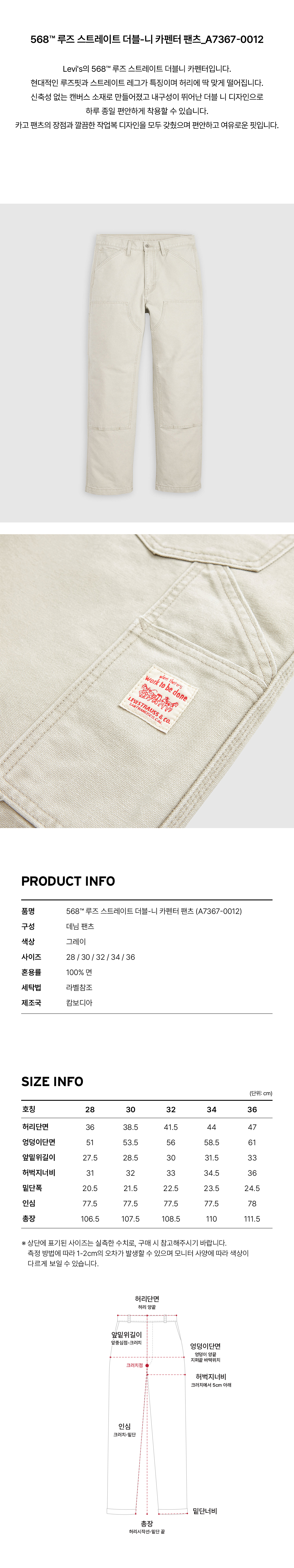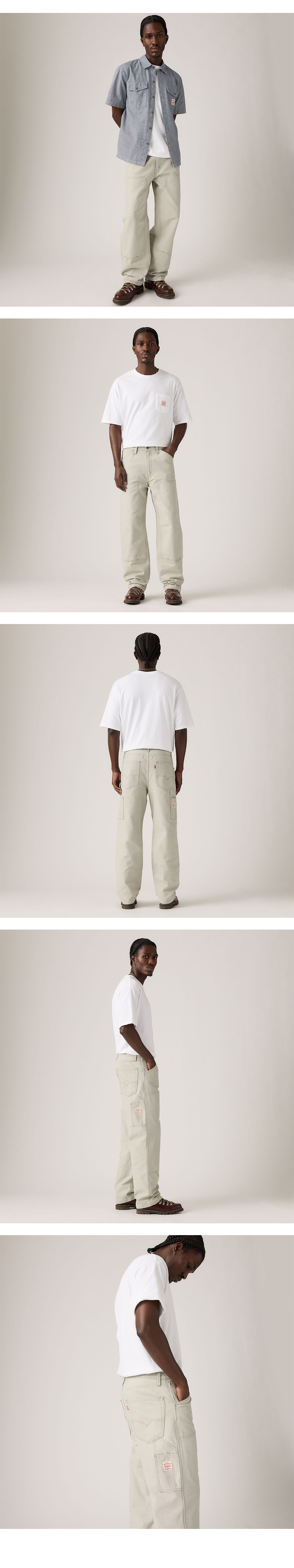 Levi's의 568™ 루즈 스트레이트 더블니 카펜터입니다. 현대적인 루즈핏과 스트레이트 레그가 특징이며 허리에 딱 맞게 떨어집니다. 신축성 없는 캔버스 소재로 만들어졌고 내구성이 뛰어난 더블 니 디자인으로 하루 종일 편안하게 착용할 수 있습니다. 카고 팬츠의 장점과 깔끔한 작업복 디자인을 모두 갖췄으며 편안하고 여유로운 핏입니다.