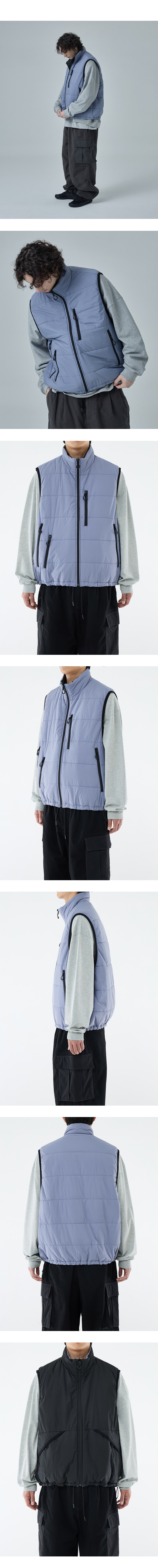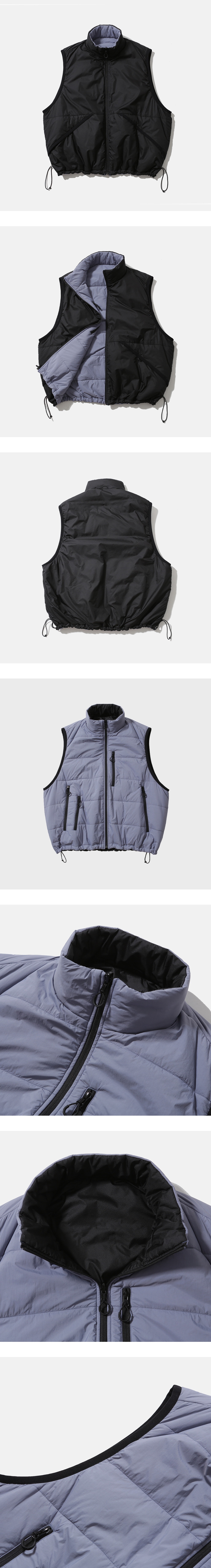 양면으로 착용 가능한 활용도가 높은 베스트 · 넉넉한 느낌의 루즈한 실루엣. · 나일론 원단 사용. · 습기는 배출하고 공기를 잡아두어, 쾌적하고 따뜻한 신슐레이트 충전재 사용. · 스탠드 카라와 지퍼가 달려 있는 앞여밈 사양. · 지퍼로 여닫을 수 있는 가슴 주머니와 사이드 주머니. · 바람을 막아주며, 실루엣 조절이 가능한 밑단 스토퍼 사양. · 넉넉한 실루엣으로 아우터 위로도 레이어링 하여 연출 가능. · 뒤집어서도 착용할 수 있는 리버서블 디자인. *안감으로 사용된 에크루 컬러는 비침이 있는 컬러로 내부 사양이 비칠 수 있습니다.