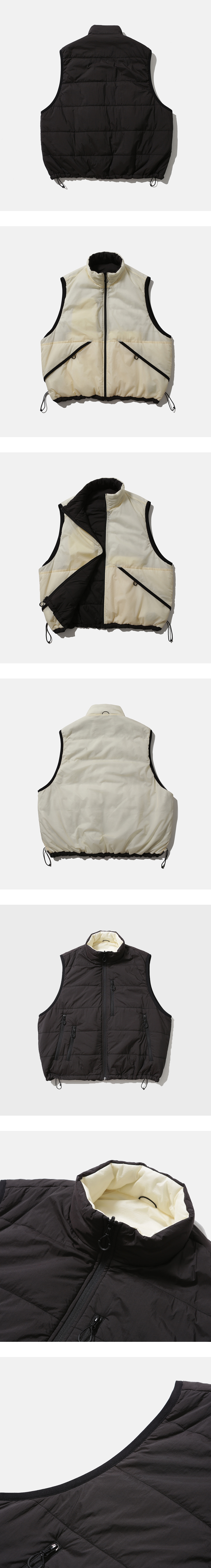 양면으로 착용 가능한 활용도가 높은 베스트 · 넉넉한 느낌의 루즈한 실루엣. · 나일론 원단 사용. · 습기는 배출하고 공기를 잡아두어, 쾌적하고 따뜻한 신슐레이트 충전재 사용. · 스탠드 카라와 지퍼가 달려 있는 앞여밈 사양. · 지퍼로 여닫을 수 있는 가슴 주머니와 사이드 주머니. · 바람을 막아주며, 실루엣 조절이 가능한 밑단 스토퍼 사양. · 넉넉한 실루엣으로 아우터 위로도 레이어링 하여 연출 가능. · 뒤집어서도 착용할 수 있는 리버서블 디자인. *안감으로 사용된 에크루 컬러는 비침이 있는 컬러로 내부 사양이 비칠 수 있습니다.