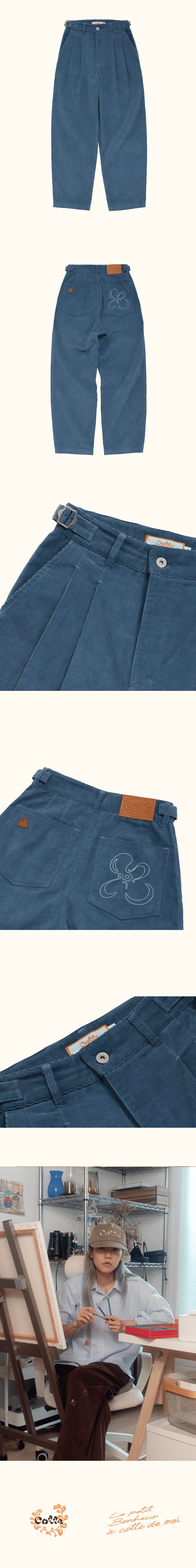Fabric - 겉감: Cotton 100% - 주머니감: Polyester 65% Cotton 35% - 가죽: Vegetable Cow Leather 100% / Made in Italy Detail - 코튼 100% 14골 코듀로이. - 이태리 베지터블 소가죽 레더탭, 포인트라벨. - YKK ONE STAR 캔톤버튼, 지퍼. - 백포켓 꼬떼 심볼 러닝스티치 자수. * 제품 색상은 제품 컷과 가장 유사합니다.