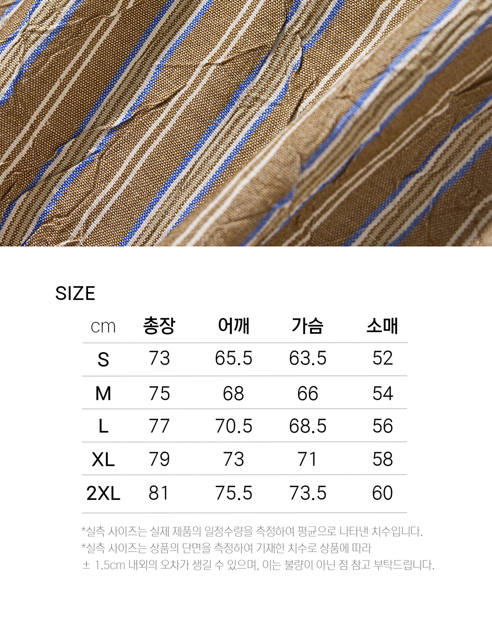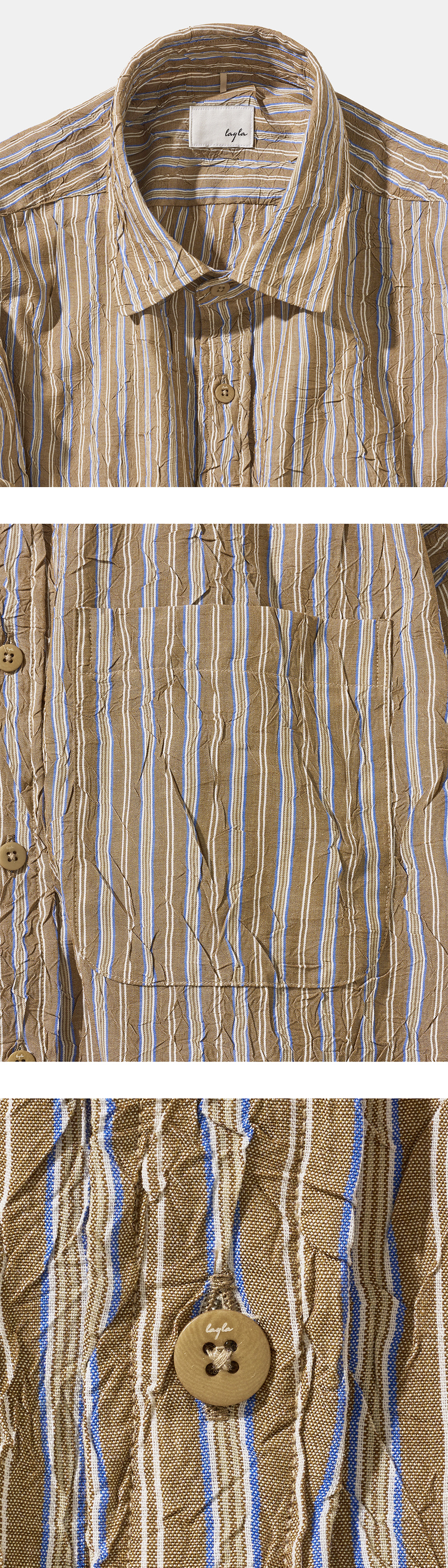 - Fit : Big Over-fit *S37-2 핏과 동일합니다. - Material : Poly 65% Cotton 35% - Season : Four seasons - Washing method : Separate cold wash, Do not Bleach, Do not tumble dry, Iron with low heat coverd by cloth - Made in KOREA - 차분한 카키빛 위로 청명한 블루와 순백의 라인이 교차하며 고요한 사막의 황혼을 닮은 빈티지 스트라이프 원단 - 자연스럽게 바랜 듯한 컬러감은 빈티지한 멋을 더해주고, 차분하면서도 세련된 무드를 연출 - 카라,커프스에 심지 부착으로 내구성 겸비 및 뒤틀림 방지 - 가슴 원포켓과 바텍 스티치 디테일로 실용성과 완성도 강화 - 빅 오버핏으로 편안하면서도 스타일리시한 실루엣 - 레이라 시그니처 agape love in layla 커프스 히든 자수 - 고급스러운 Layla 각인 우드 컬러 단추