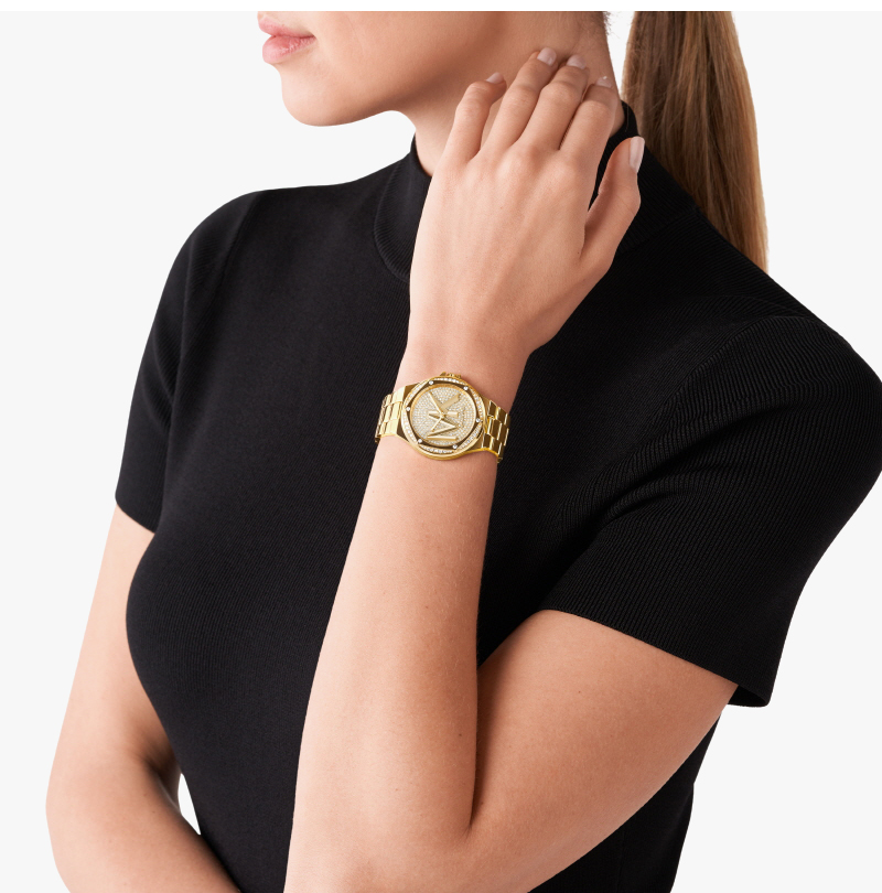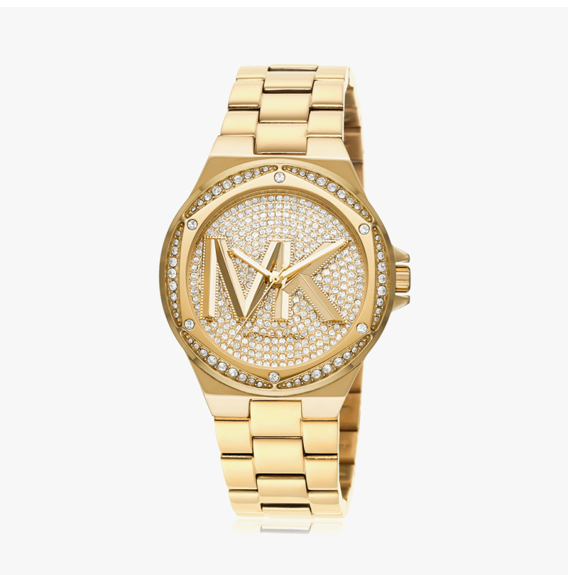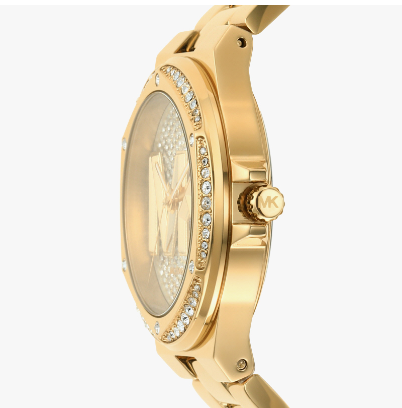 (W) Michael Kors Lennox Pave Three-Hand Stainless Steel Watch Gold