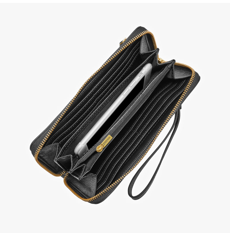 Fossil Logan Leather RFID Zip Around Clutch Wallet Black