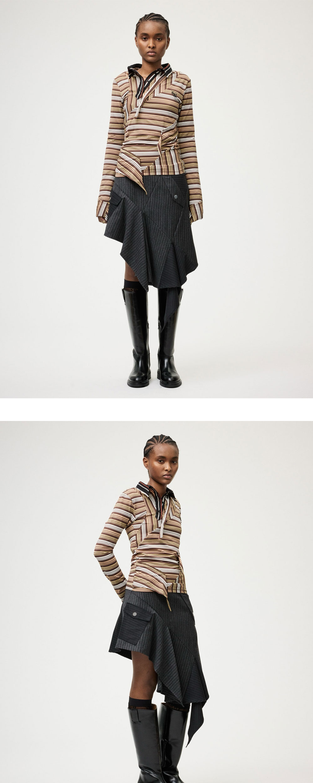 비대칭 디자인의 레이브 리뷰 우먼 노아 어시메트릭 스커트 위드 포켓 디테일 멀티 핀 스트라이프입니다. - 허리의 투 벨트 루프 구조 - 비대칭 절개가 돋보이는 패치워크 디자인 - 드레이프가 살아있는 비대칭 밑단 실루엣