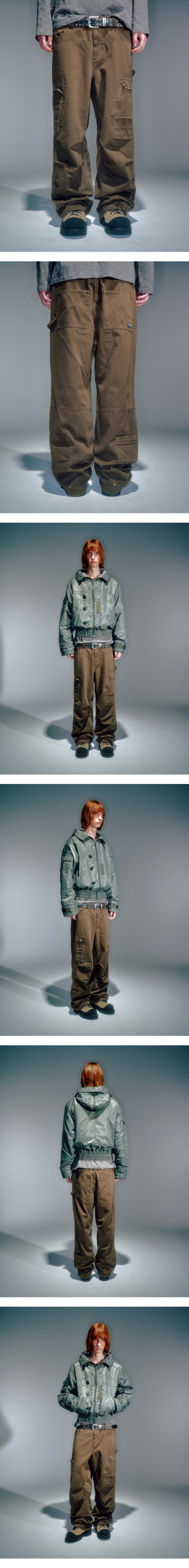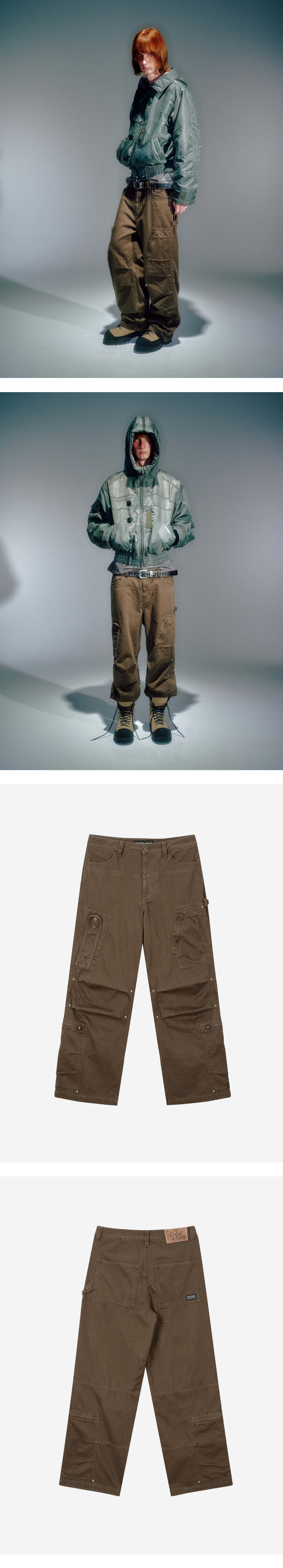 YKK 지퍼 사용 밀리터리 칼집 포켓 디테일과 워크웨어 포켓 디테일을 비대칭하게 배치 양쪽 밑단 포켓 사용으로 수납공간 확보 가먼츠 워싱으로 빈티지한 컬러감 구현 무릎 턱 디테일로 인한 입체적인 실루엣 베이컨트 제작 리벳 사용 M/L (CM) Length : 106 / 108 Waist : 43 / 45 Hip : 53 / 55 Thigh : 33.5 / 34.5 Front Rise : 33.5 / 34.5 Hem : 27 / 28