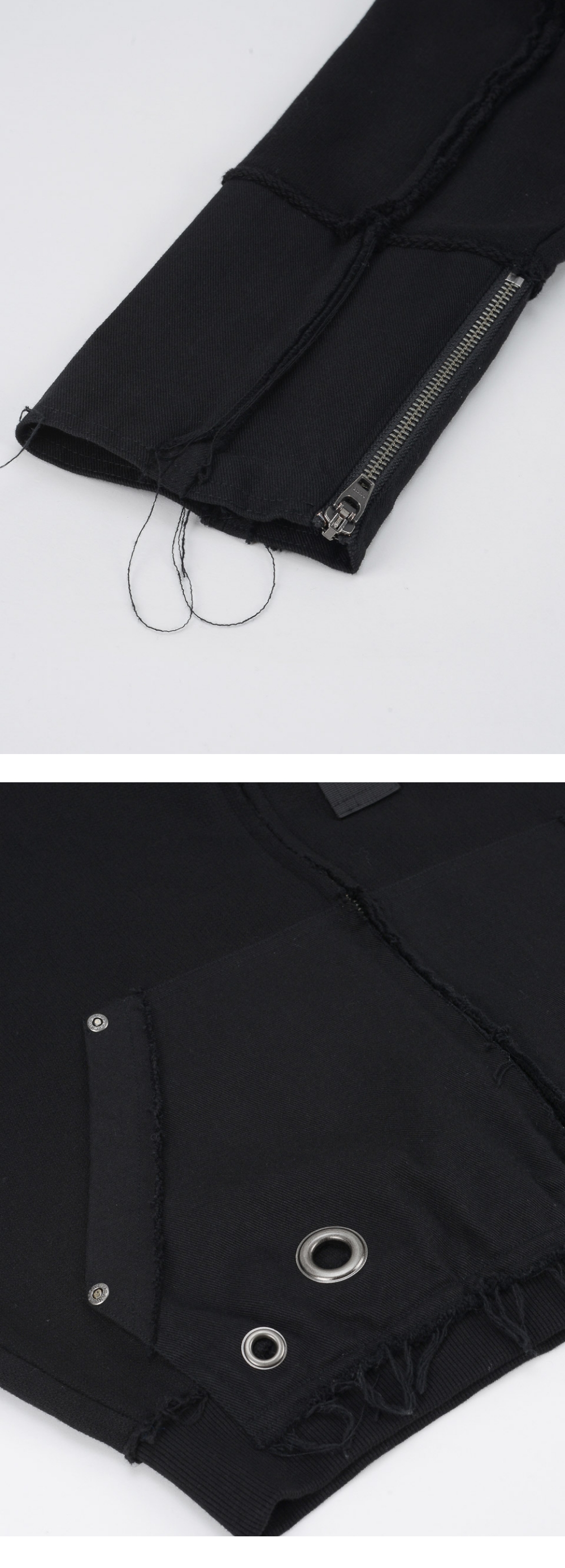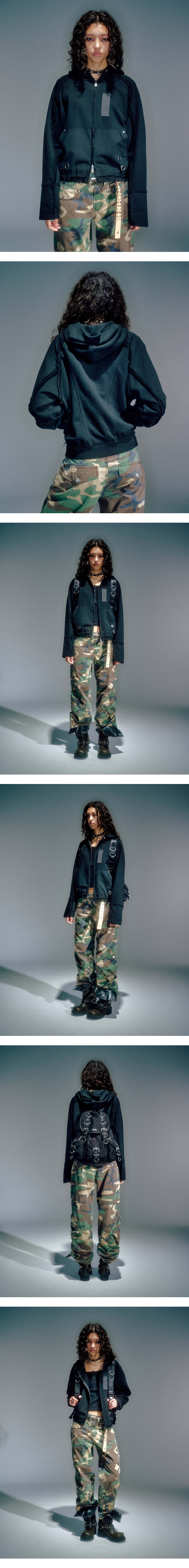 소재 배색으로 레이어드 스타일 연출 가먼츠 워싱 아일렛 장식 사용 데미지 가공으로 빈티지함 연출 밀리터리 웨빙 디테일 빈티지한 올풀림 연출 YKK 2WAY 지퍼 사용 S/M (CM) Length : 53 / 55 Bust : 60 / 62 Sleeve (화장) : 85 / 87