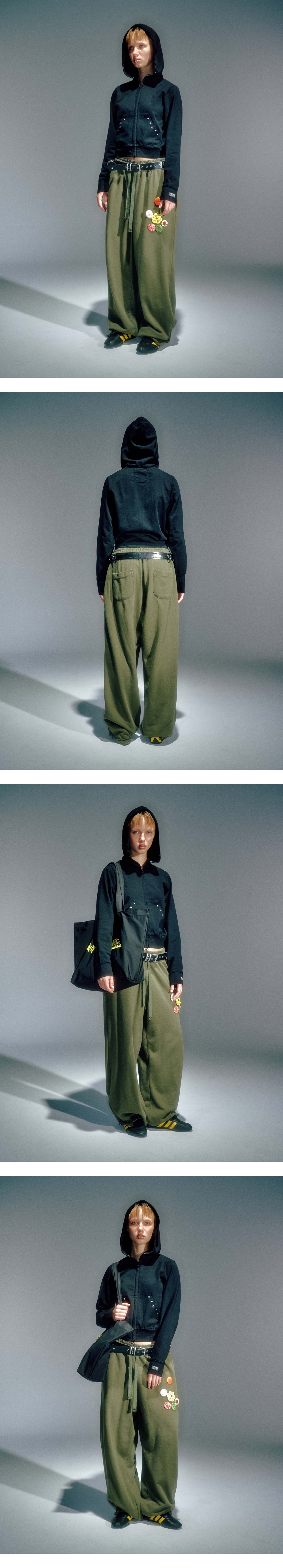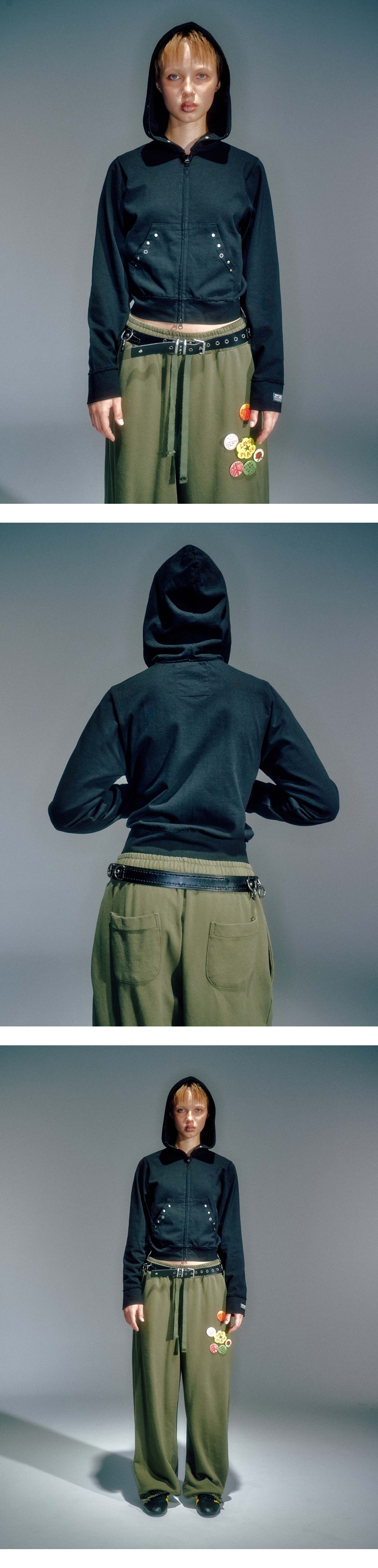 크롭한 기장의 캐주얼한 무드의 후드 집업 싱글 원단 사용으로 가벼운 아웃웨어부터 이너웨어까지 활용 후드/주머니 라인따라 배치된 메탈 스터드 장식 포인트 소매/밑단 홀겹 재봉하여 빈티지한 디테일 연출 S (CM) Length : 53 Shoulder : 38 Bust : 43.5 Sleeve : 64.5