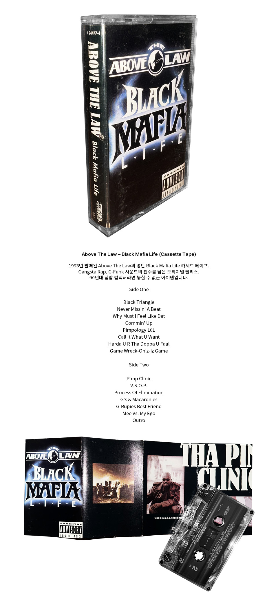 Above The Law – Black Mafia Life (Cassette Tape) 1993년 발매된 Above The Law의 명반 Black Mafia Life 카세트 테이프. Gangsta Rap, G-Funk 사운드의 진수를 담은 오리지널 릴리스. 90년대 힙합 컬렉터라면 놓칠 수 없는 아이템입니다.