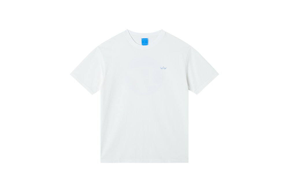 30수 2P 원사 두 가닥으로 만든 편직물을 활용하여 헤비하게 완성된 흰색의 티셔츠에 가먼트다잉 기법으로 염색합니다. 흰색에 가까운 색으로 염색된 티셔츠의 곳곳에 빈티한 느낌이 머뭅니다. 완성된 티셔츠에 수성 핸드 실크스크린 날염으로 시간이 지남에 따라 티셔츠와 함께 그래픽도 함께 낡아갑니다.