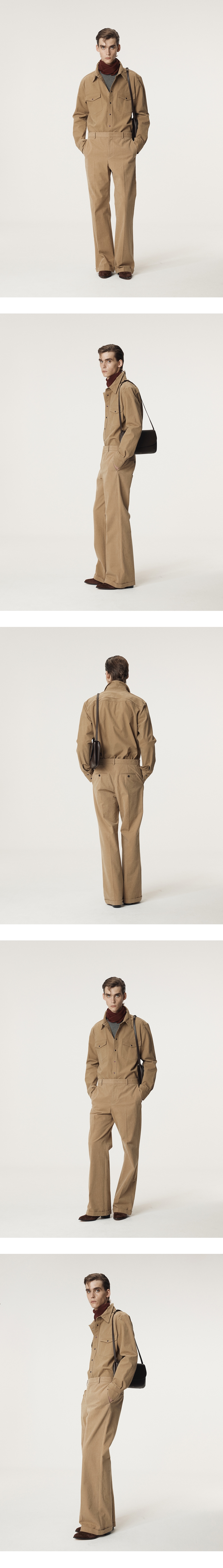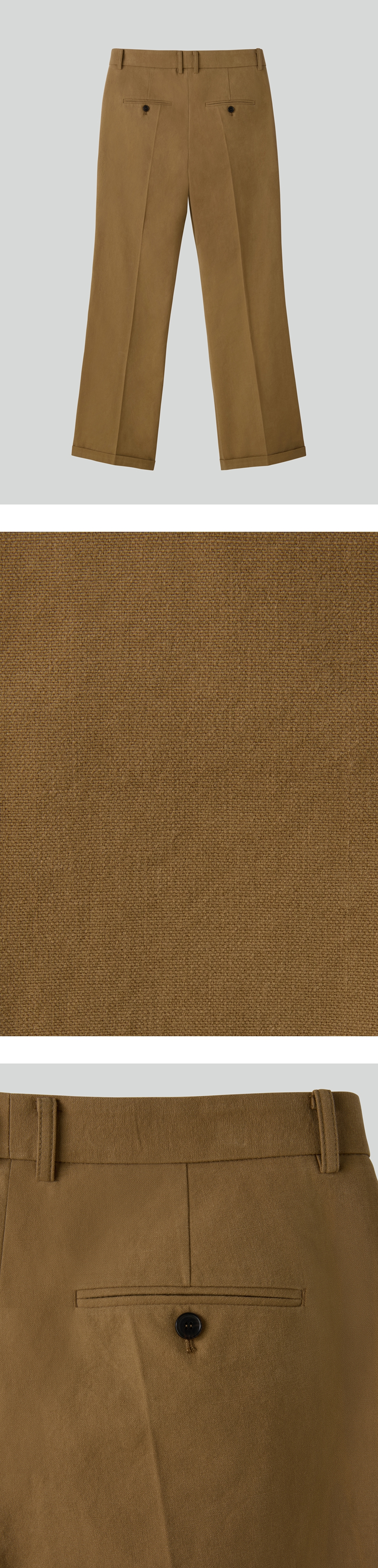 - 피치 가공과 워싱을 더해 완성된 빈티지 텍스처의 코튼 캔버스 - 여유로운 플레어 실루엣으로 자연스럽고 세련된 라인 연출 - 뒷 포켓 소뿔 단추 디테일이 더하는 클래식 무드 - 밑단 카브라 처리로 완성도를 높인 디자인 - 앞뒤 프레스 디테일로 깔끔하고 단정한 핏 유지
